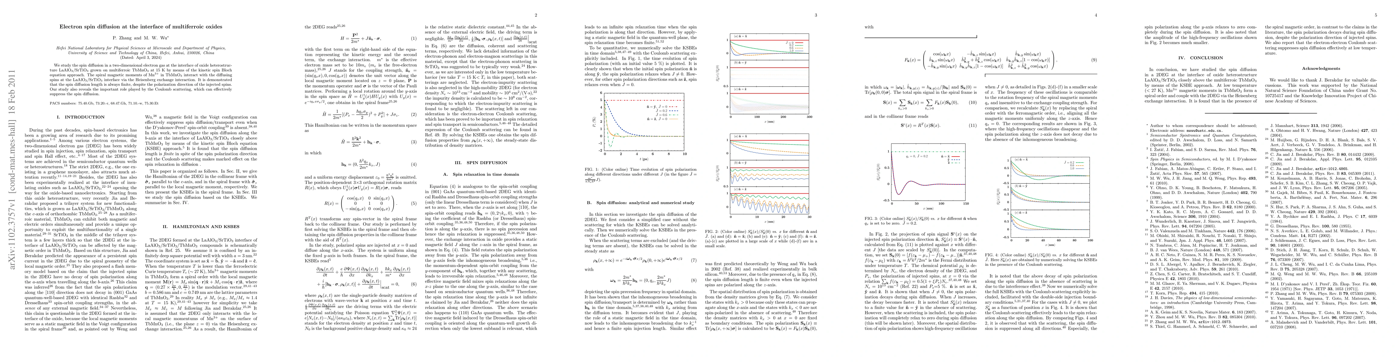 We study the spin diffusion in a two-dimensional electron gas at the interface of oxide heterostructure LaAlO$_3$/SrTiO$_3$ grown on multiferroic TbMnO$_3$ at 15 K by means of the kinetic spin Bloch equation approach. The spiral magnetic moments of Mn$^{3+}$ in TbMnO$_3$ interact with the diffusing spins at the LaAlO$_3$/SrTiO$_3$ interface via the Heisenberg exchange interaction. It is demonstrated that the spin diffusion length is always finite, despite the polarization direction of the injected spins. Our study also reveals the important role played by the Coulomb scattering, which can effectively suppress the spin diffusion.