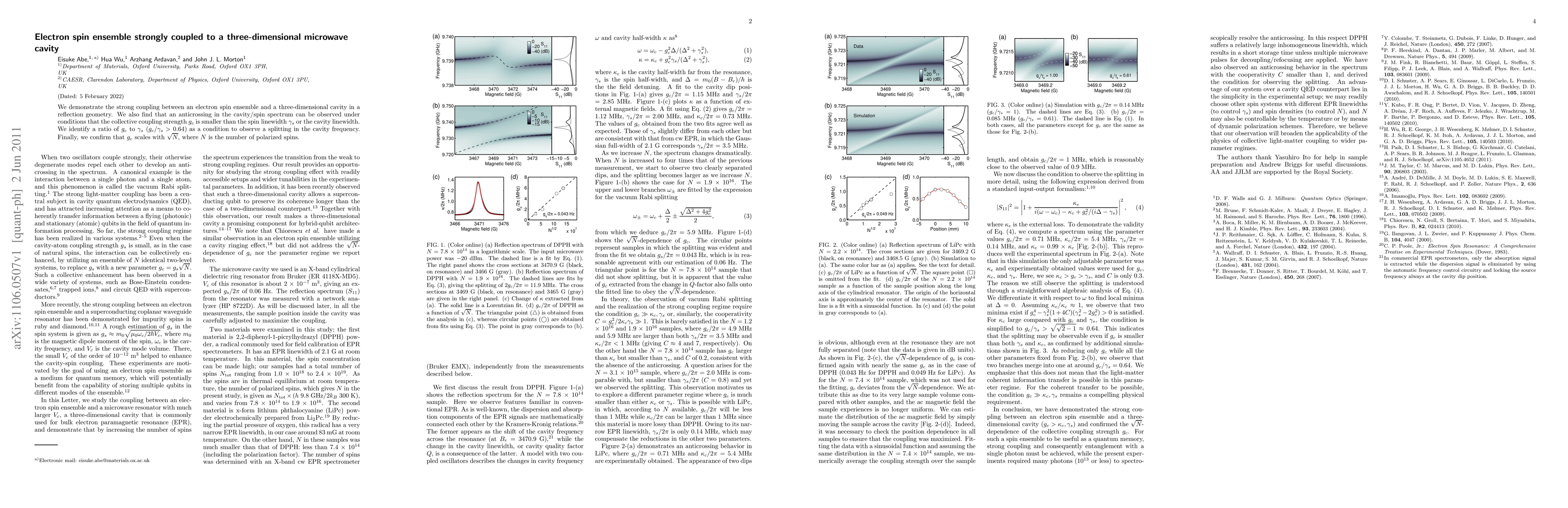 We demonstrate the strong coupling between an electron spin ensemble and a three-dimensional cavity in a reflection geometry. We also find that an anticrossing in the cavity/spin spectrum can be observed under conditions that the collective coupling strength $g_c$ is smaller than the spin linewidth $\gamma_s$ or the cavity linewidth. We identify a ratio of $g_c$ to $\gamma_s$ ($g_c/\gamma_s >$ 0.64) as a condition to observe a splitting in the cavity frequency. Finally, we confirm that $g_c$ scales with $\sqrt{N}$, where $N$ is the number of polarized spins.
