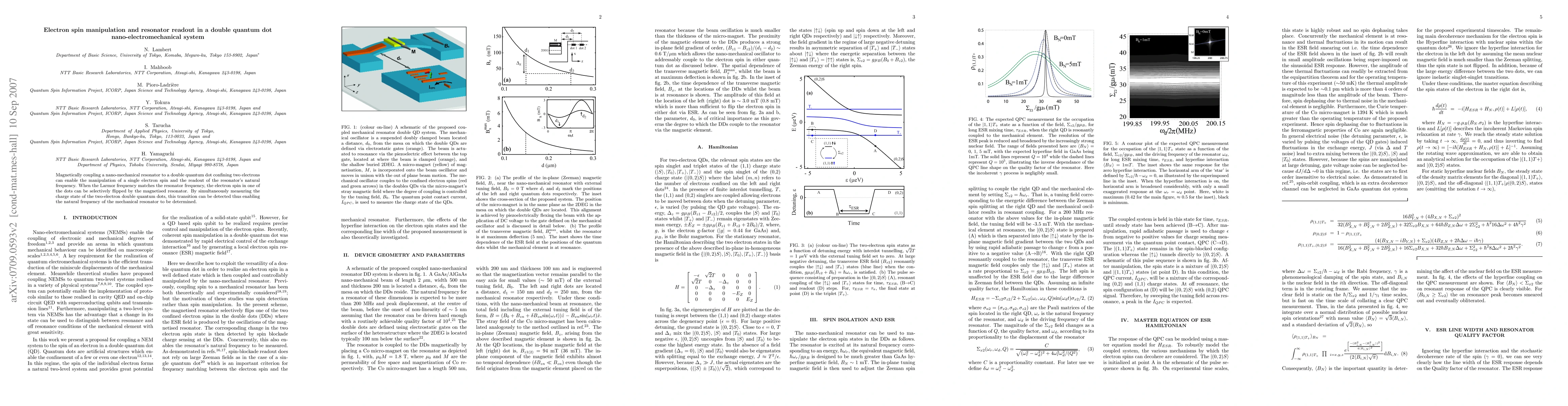 This research explores the manipulation of electron spins and readout of a nano-mechanical resonator's frequency through magnetic coupling in a double quantum dot system, where spin flipping occurs when the Larmor frequency matches the resonator frequency, allowing for detection via charge state measurement.