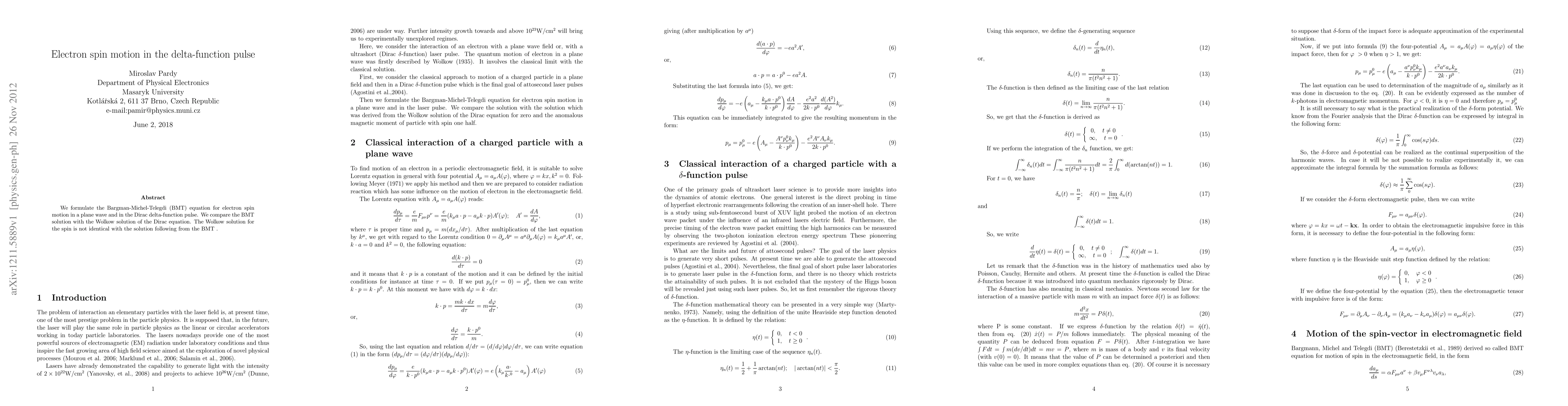 We formulate the Bargman-Michel-Telegdi (BMT) equation for electron spin motion in a plane wave and in the Dirac delta-function pulse. We compare the BMT solution with the Wolkow solution of the Dirac equation. The Wolkow solution for the spin is not identical with the solution following from the BMT .