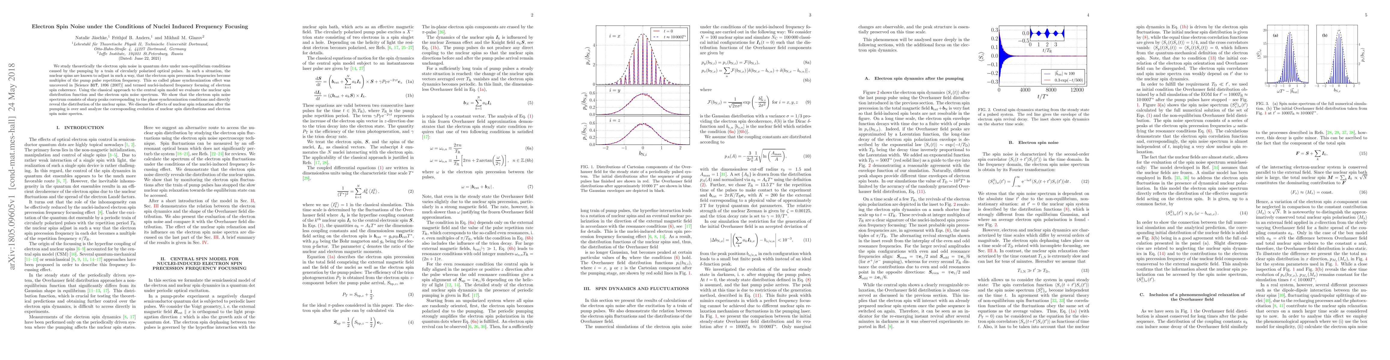 This paper theoretically investigates electron spin noise in quantum dots under non-equilibrium conditions induced by circularly polarized optical pulses. It reveals sharp peaks in the electron spin noise spectrum due to nuclei-induced frequency focusing, directly showing the nuclear spin distribution. The study also examines the effects of nuclear spin relaxation post-pumping on the nuclear spin distributions and electron spin noise spectra.