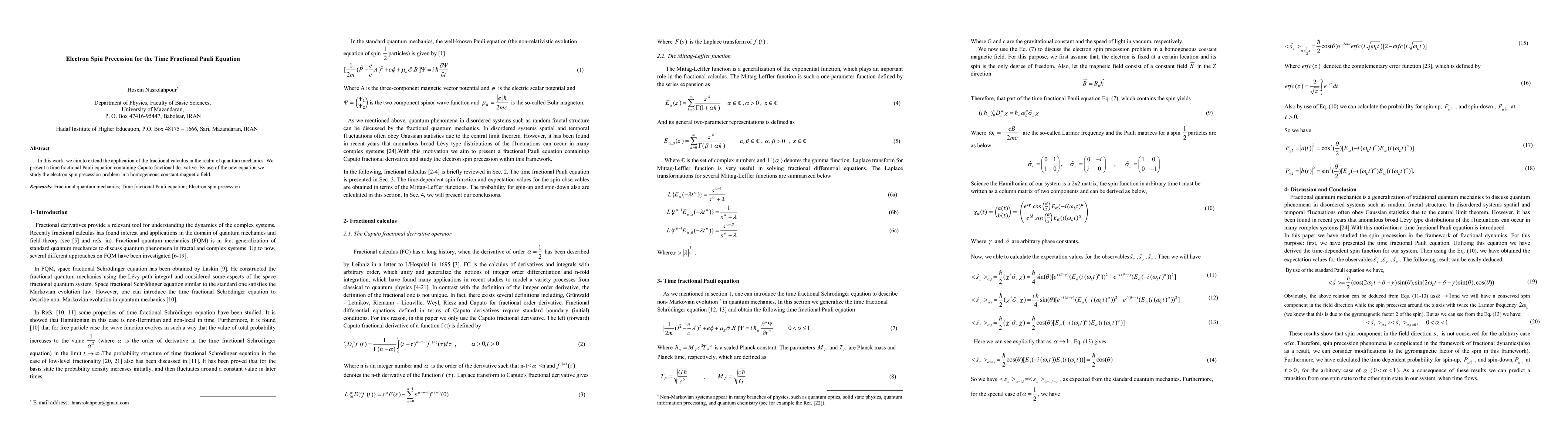 In this work, we aim to extend the application of the fractional calculus in the realm of quantum mechanics. We present a time fractional Pauli equation containing Caputo fractional derivative. By use of the new equation we study the electron spin precession problem in a homogeneous constant magnetic field.