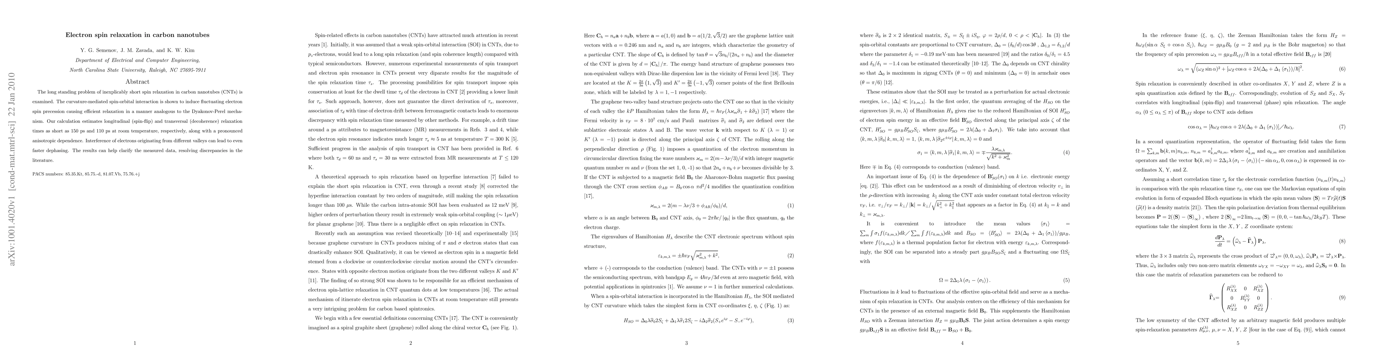 The study investigates the short spin relaxation in carbon nanotubes, attributing it to curvature-induced spin-orbital interaction akin to the Dyakonov-Perel mechanism, with calculated relaxation times as short as 150 ps for longitudinal and 110 ps for transversal relaxation at room temperature, revealing anisotropic dependence and potential faster dephasing from valley interference.