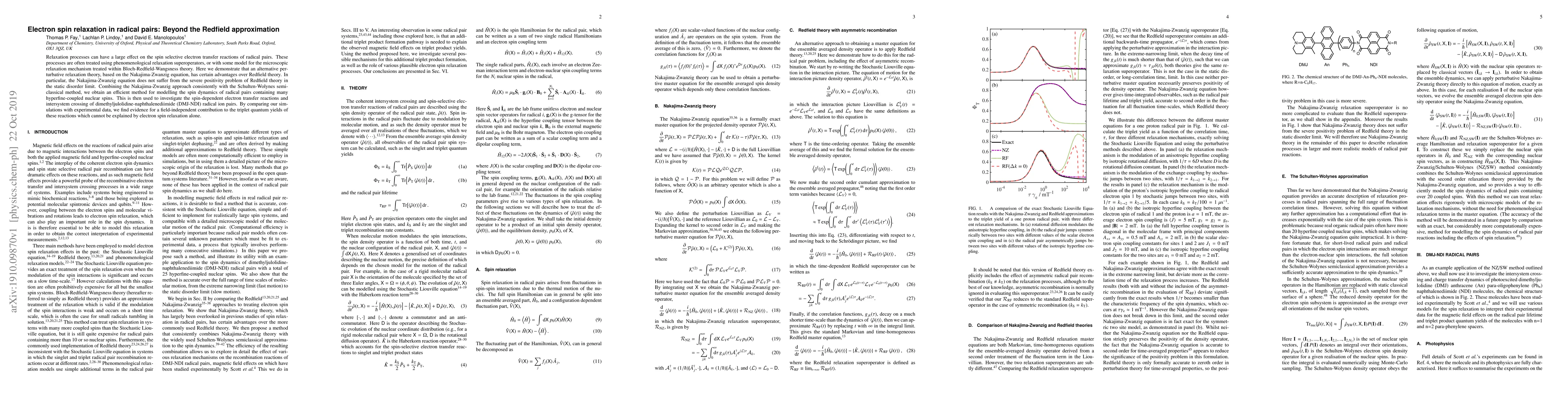 This research proposes an alternative perturbative relaxation theory based on the Nakajima-Zwanzig equation to model electron spin relaxation in radical pairs, demonstrating its advantages over Redfield theory. It identifies a field-independent contribution to triplet quantum yields in DMJ-NDI radical ion pairs, suggesting mechanisms beyond simple spin relaxation.