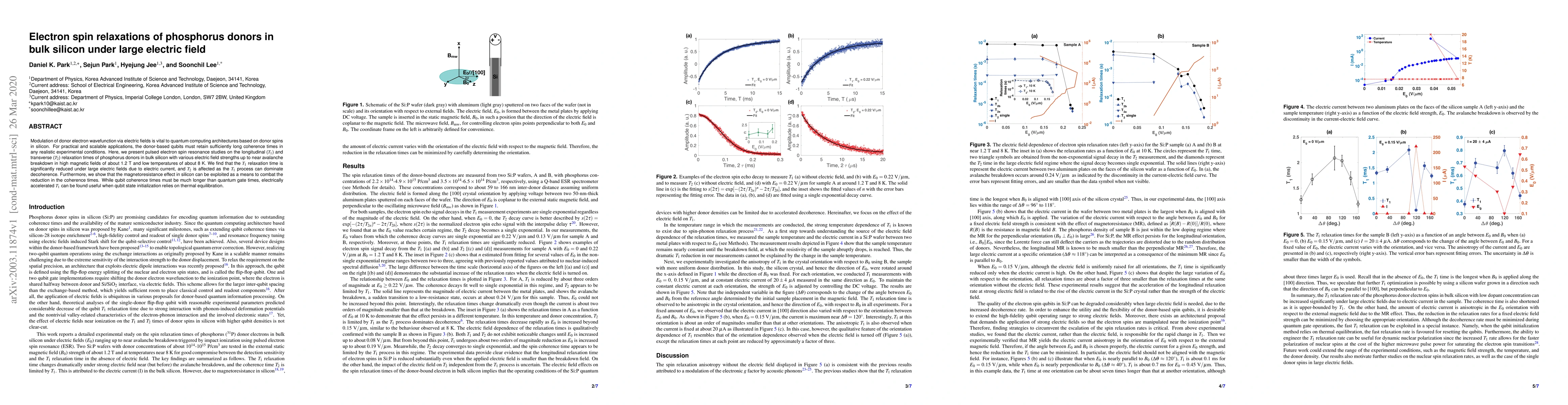 This study investigates the impact of large electric fields on the electron spin relaxation times of phosphorus donors in bulk silicon, revealing reduced $T_1$ and $T_2$ coherence times due to electric current. The research suggests exploiting magnetoresistance to mitigate coherence loss, highlighting potential benefits for qubit state initialization.