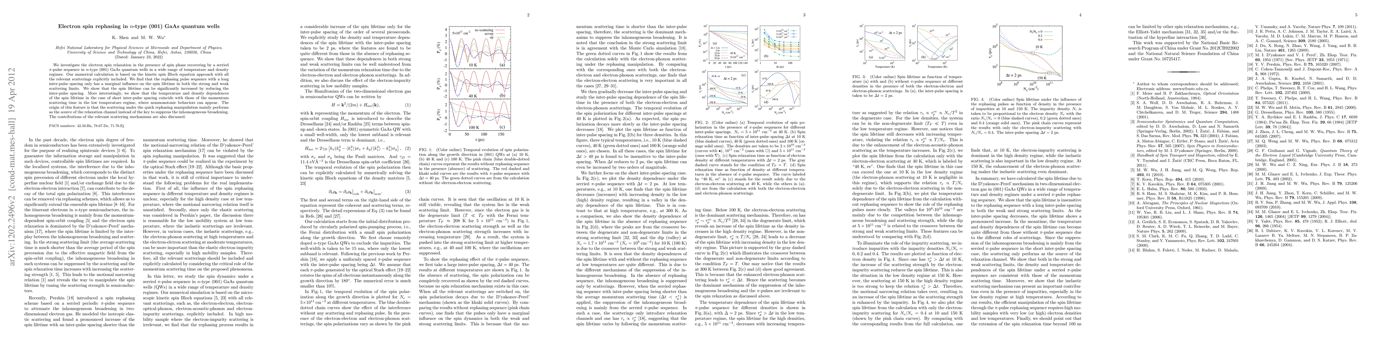 We investigate the electron spin dephasing in the presence of spin phase recovering by a serried $\pi$-pulse sequence in $n$-type (001) GaAs quantum wells in a wide range of temperature and density regimes. Our numerical calculation is based on the kinetic spin Bloch equation approach with all the relevant scatterings explicitly included. We find that the rephasing pulse sequence with a long inter-pulse spacing only has a marginal influence on the spin lifetime in both the strong and weak scattering limits. We show that the spin lifetime can be significantly increased by reducing the inter-pulse spacing. More interestingly, we show that the temperature and density dependences of the spin lifetime in the case of short inter-pulse spacing coincide with those of the momentum scattering time in the low temperature regime, where nonmonotonic behaviors can appear. The origin of this feature is that the scattering under the quick rephasing manipulation mainly performs as the source of the dephasing channel instead of the key to suppress the inhomogeneous broadening. The contributions of the relevant scattering mechanisms are also discussed.