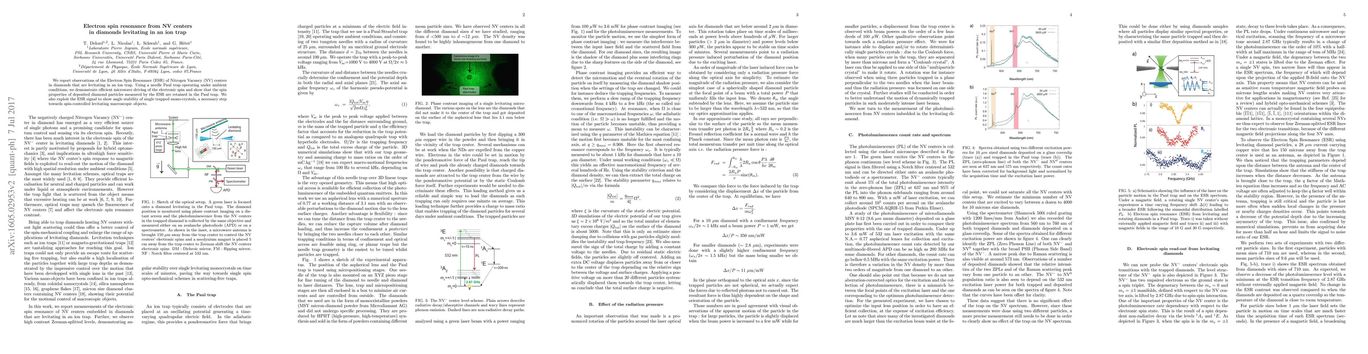 This paper reports on Electron Spin Resonance (ESR) from Nitrogen Vacancy (NV) centers in diamonds levitating in an ion trap, demonstrating efficient microwave driving of the electronic spin and monitoring the rotation of levitating monocrystals, paving the way for spin-controlled mechanical systems.