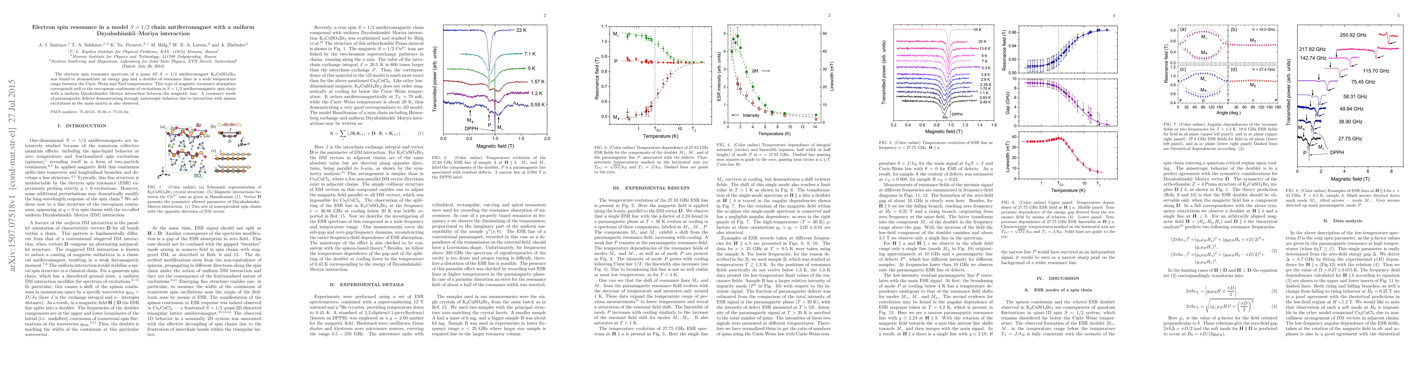 The study investigates electron spin resonance in a quasi 1D S=1/2 antiferromagnet, K2CuSO4Br2, revealing an energy gap and doublet resonance lines, consistent with two-spinon excitations in a Dzyaloshinskii-Moriya interaction-dominated spin chain. Additionally, a paramagnetic defect resonance mode with anisotropic behavior is detected.