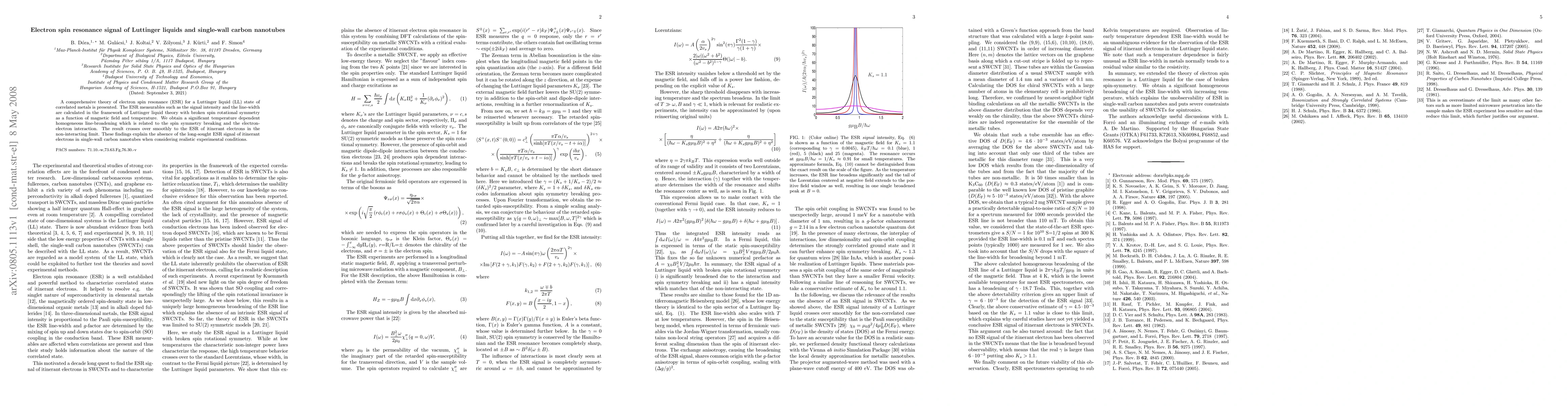 This paper presents a theory of electron spin resonance (ESR) for Luttinger liquids, showing significant temperature-dependent line-broadening due to spin symmetry breaking and electron-electron interactions. It explains the absence of ESR signals in single-wall carbon nanotubes under realistic conditions.