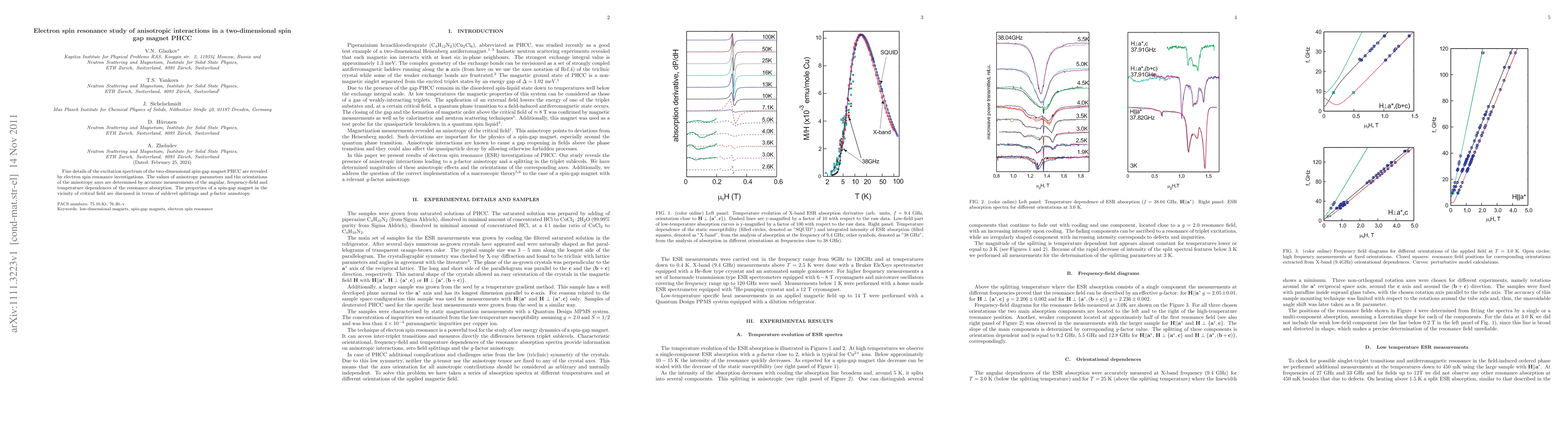 This paper uses electron spin resonance to investigate the anisotropic interactions in the two-dimensional spin-gap magnet PHCC, determining anisotropy parameters and axes orientations through precise measurements of resonance absorption dependencies. The study discusses the magnet's properties near critical field, focusing on sublevel splittings and g-factor anisotropy.