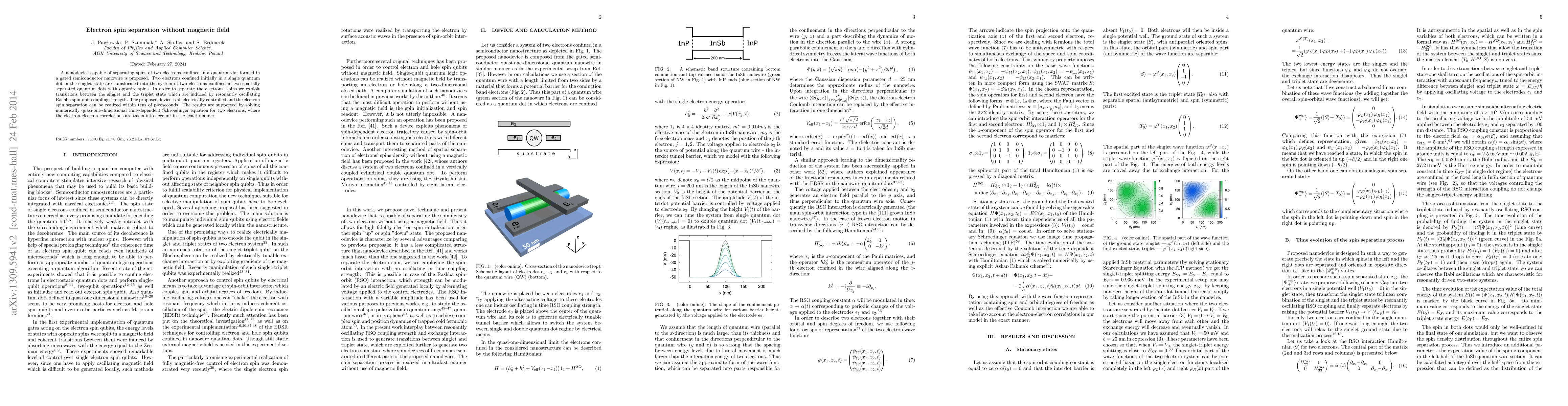 A nanodevice capable of separating spins of two electrons confined in a quantum dot formed in a gated semiconductor nanowire is proposed. Two electrons confined initially in a single quantum dot in the singlet state are transformed into the system of two electrons confined in two spatially separated quantum dots with opposite spins. In order to separate the electrons' spins we exploit transitions between the singlet and the triplet state which are induced by resonantly oscillating Rashba spin-obit coupling strength. The proposed device is all electrically controlled and the electron spin separation can be realized within tens of picoseconds. The results are supported by solving numerically quasi-one-dimensional time-dependent Schroedinger equation for two electrons, where the electron-electron correlations are taken into account in the exact manner.