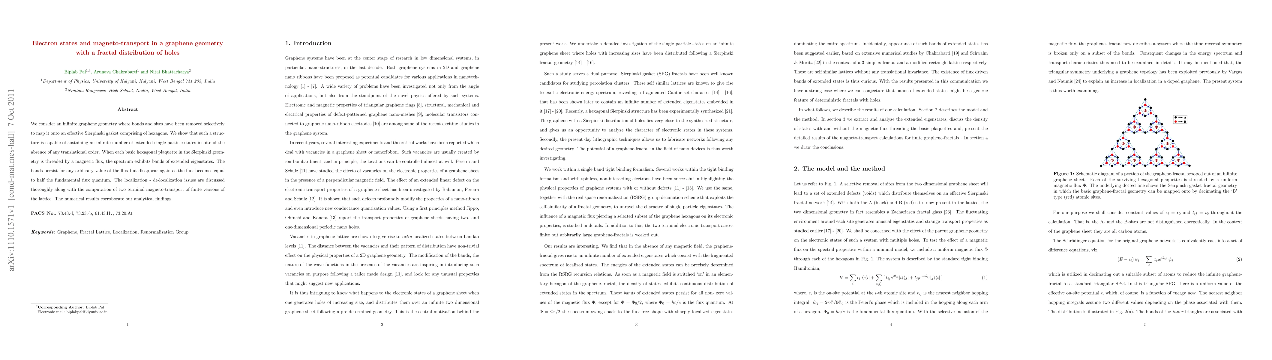 We consider an infinite graphene geometry where bonds and sites have been removed selectively to map it onto an effective Sierpinski gasket comprising of hexagons. We show that such a structure is capable of sustaining an infinite number of extended single particle states inspite of the absence of any translational order. When each basic hexagonal plaquette in the Sierpinski geometry is threaded by a magnetic flux, the spectrum exhibits bands of extended eigenstates. The bands persist for any arbitrary value of the flux but disappear again as the flux becomes equal to half the fundamental flux quantum. The localization - de-localization issues are discussed thoroughly along with the computation of two terminal magneto-transport of finite versions of the lattice. The numerical results corroborate our analytical findings.