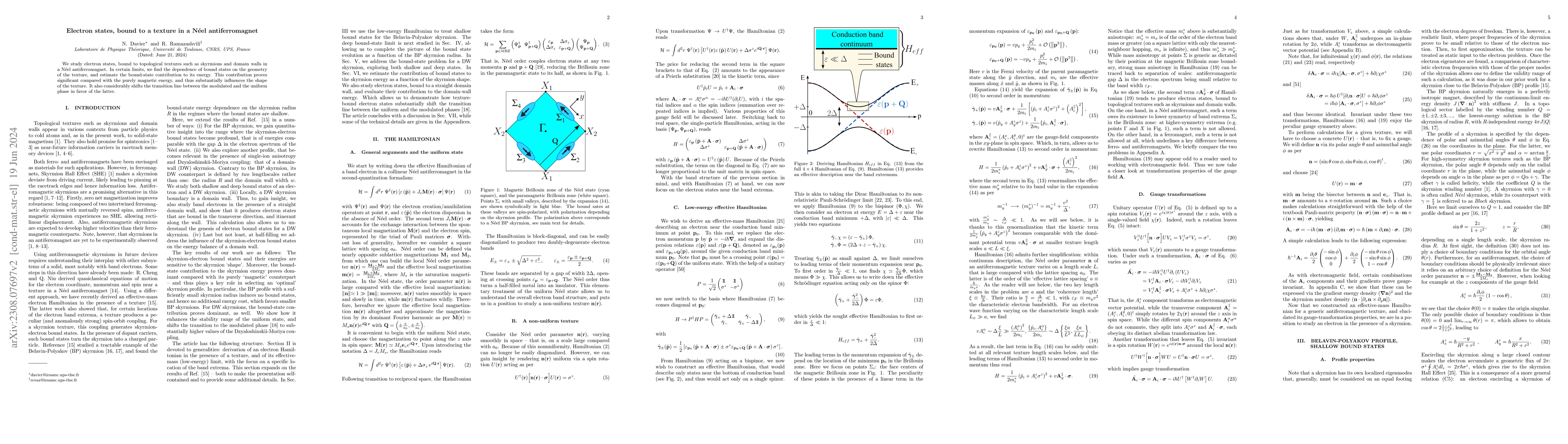 This paper investigates electron states bound to topological textures like skyrmions and domain walls in a Néel antiferromagnet, finding significant bound-state contributions to the texture's energy that notably alter its geometry and extend the uniform phase transition line.