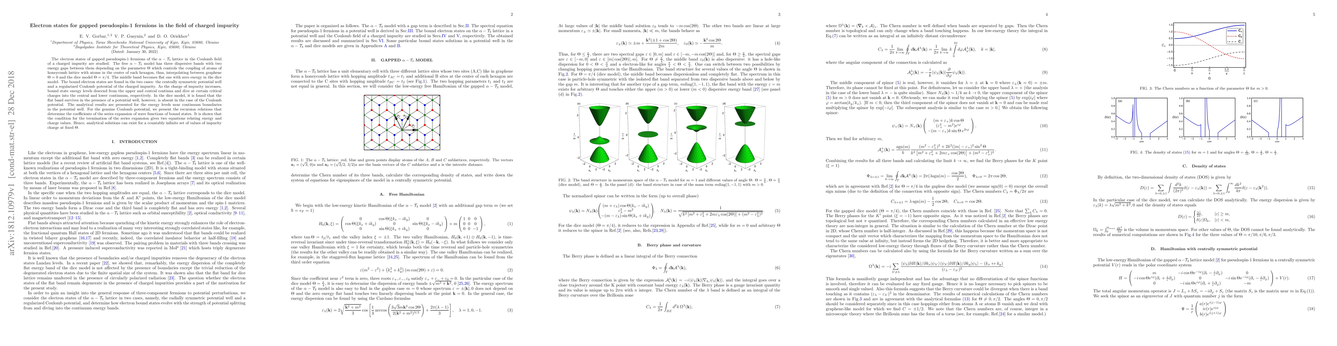 The electron states of gapped pseudospin-1 fermions of the $\alpha-{\cal T}_3$ lattice in the Coulomb field of a charged impurity are studied. The free $\alpha-{\cal T}_3$ model has three dispersive bands with two energy gaps between them depending on the parameter $\Theta$ which controls the coupling of atoms of honeycomb lattice with atoms in the center of each hexagon, thus, interpolating between graphene $\Theta=0$ and the dice model $\Theta=\pi/4$. The middle band becomes flat one with zero energy in the dice model. The bound electron states are found in the two cases: the centrally symmetric potential well and a regularized Coulomb potential of the charged impurity. As the charge of impurity increases, bound state energy levels descend from the upper and central continua and dive at certain critical charges into the central and lower continuum, respectively. In the dice model, it is found that the flat band survives in the presence of a potential well, however, is absent in the case of the Coulomb potential. The analytical results are presented for the energy levels near continuum boundaries in the potential well. For the genuine Coulomb potential, we present the recursion relations that determine the coefficients of the series expansion of wave functions of bound states. It is shown that the condition for the termination of the series expansion gives two equations relating energy and charge values. Hence, analytical solutions can exist for a countably infinite set of values of impurity charge at fixed $\Theta$.