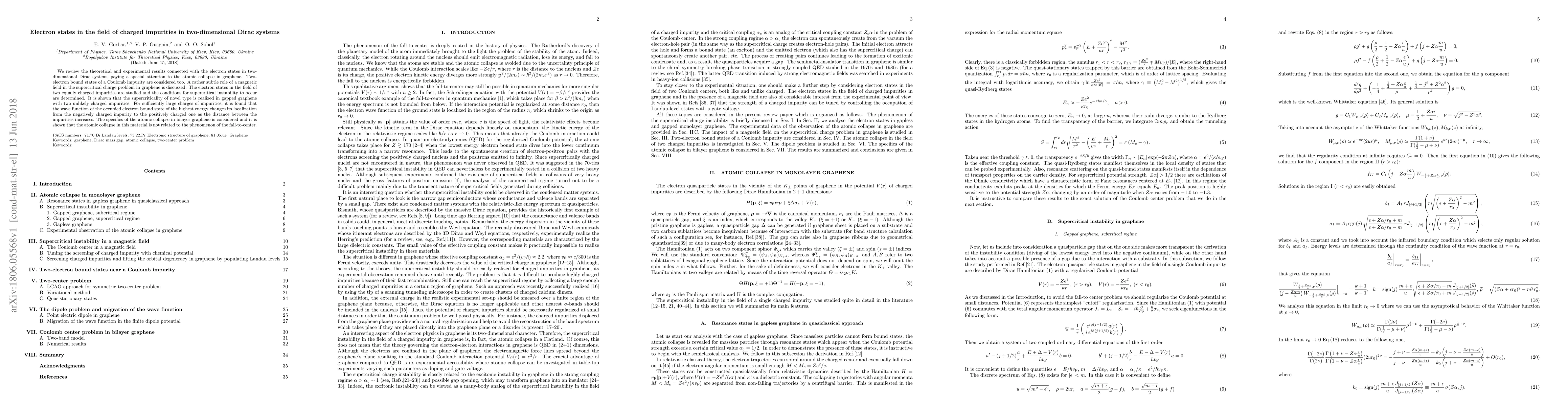 We review the theoretical and experimental results connected with the electron states in two-dimensional Dirac systems paying a special attention to the atomic collapse in graphene. Two-electron bound states of a Coulomb impurity are considered too. A rather subtle role of a magnetic field in the supercritical charge problem in graphene is discussed. The electron states in the field of two equally charged impurities are studied and the conditions for supercritical instability to occur are determined. It is shown that the supercriticality of novel type is realized in gapped graphene with two unlikely charged impurities. For sufficiently large charges of impurities, it is found that the wave function of the occupied electron bound state of the highest energy changes its localization from the negatively charged impurity to the positively charged one as the distance between the impurities increases. The specifics of the atomic collapse in bilayer graphene is considered and it is shown that the atomic collapse in this material is not related to the phenomenon of the fall-to-center.