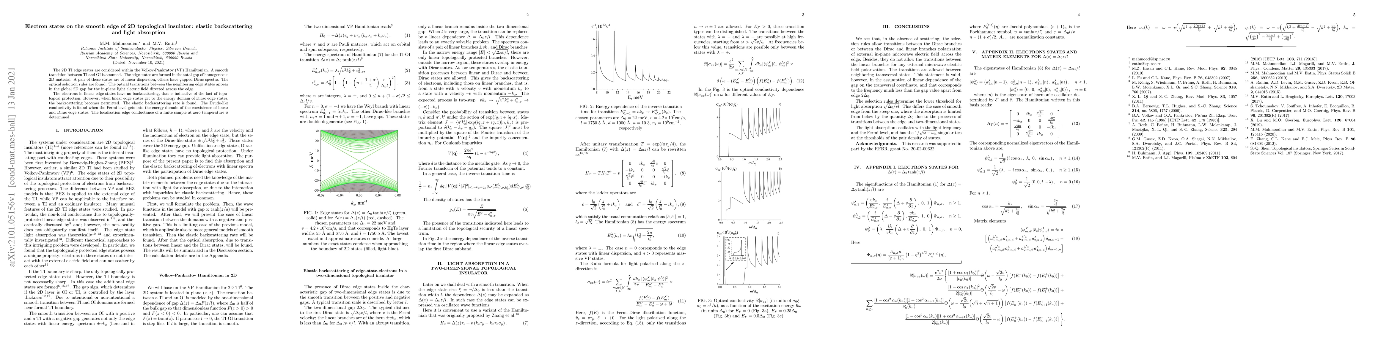 The 2D TI edge states are considered within the Volkov-Pankratov (VP) Hamiltonian. A smooth transition between TI and OI is assumed. The edge states are formed in the total gap of homogeneous 2D material. A pair of these states are of linear dispersion, others have gapped Dirac spectra. The optical selection rules are found. The optical transitions between the neighboring edge states appear in the global 2D gap for the in-plane light electric field directed across the edge. The electrons in linear edge states have no backscattering, that is indicative of the fact of topological protection. However, when linear edge states get to the energy domain of Dirac edge states, the backscattering becomes permitted. The elastic backscattering rate is found. The Drude-like conductivity is found when the Fermi level gets into the energy domain of the coexistence of linear and Dirac edge states. The localization edge conductance of a finite sample at zero temperature is determined.