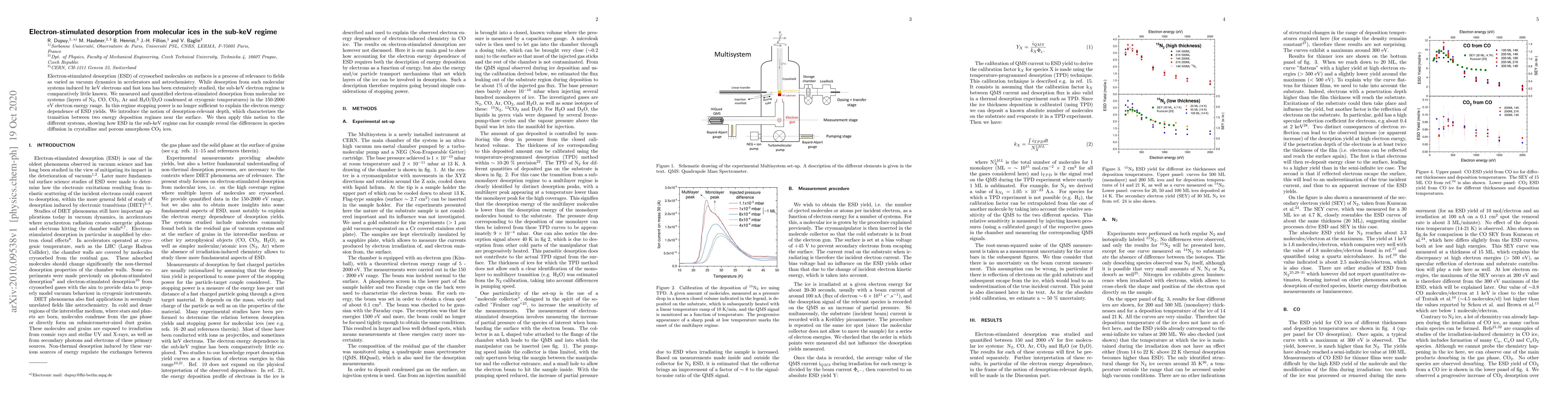 This study investigates electron-stimulated desorption (ESD) from molecular ices (N$_2$, CO, CO$_2$, Ar, and H$_2$O/D$_2$O) at sub-keV electron energies, revealing that stopping power alone does not explain ESD yields. The concept of desorption-relevant depth is introduced to characterize the transition between energy deposition regimes, providing insights into species diffusion differences in crystalline and amorphous CO$_2$ ices.