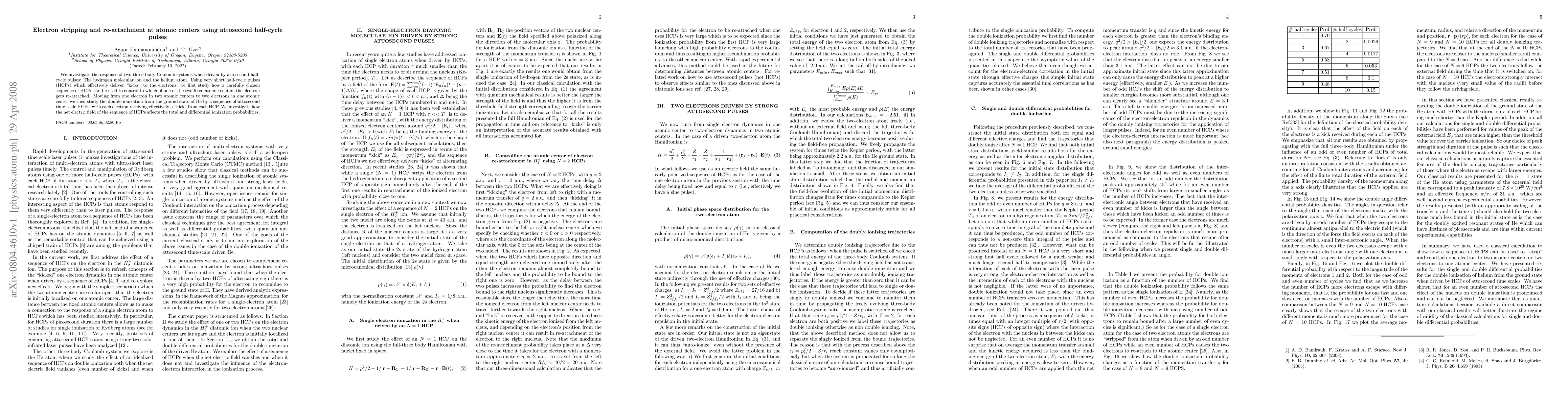 This paper explores the manipulation of electron behavior in hydrogen molecular ions and helium atoms using attosecond half-cycle pulses, demonstrating how these pulses can control electron re-attachment to atomic centers and influence double ionization processes. The study highlights the impact of the net electric field from pulse sequences on ionization probabilities.