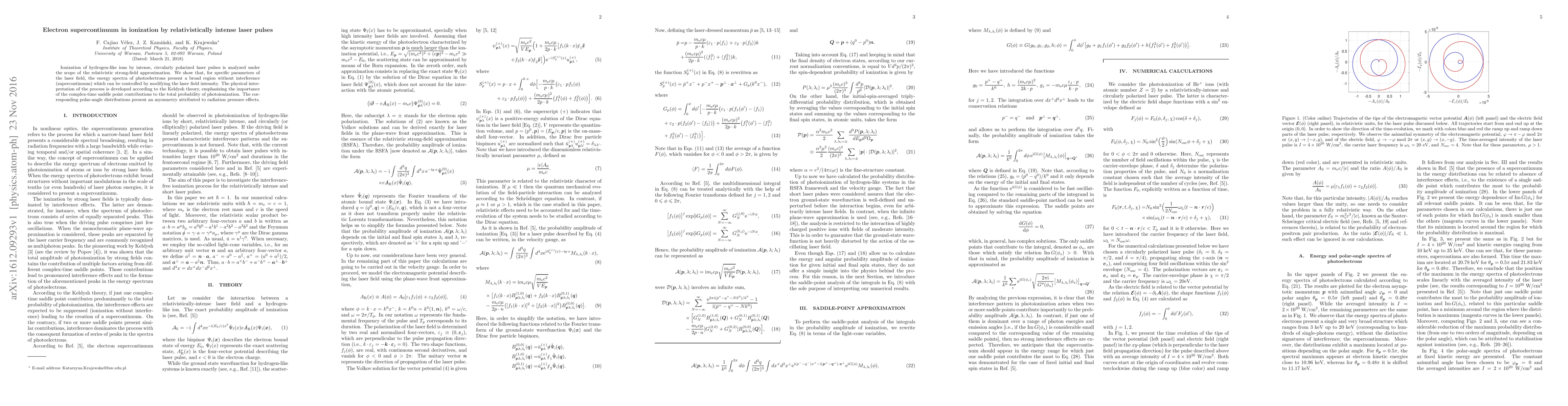 This paper investigates the ionization of hydrogen-like ions by relativistically intense, circularly polarized laser pulses, revealing a broad, interference-free region in the photoelectron energy spectra termed a "supercontinuum." The study employs the relativistic strong-field approximation and the Keldysh theory to explain the phenomenon, highlighting the role of complex-time saddle point contributions and radiation pressure effects.