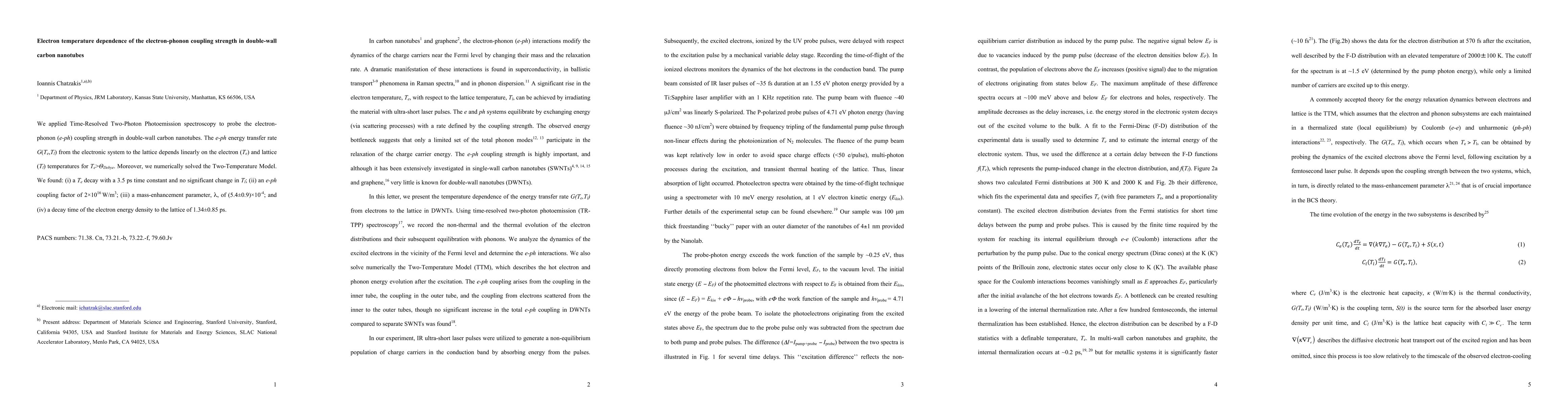 This study investigates electron-phonon coupling in double-wall carbon nanotubes using Time-Resolved Two-Photon Photoemission spectroscopy, revealing a linear dependence of the e-ph energy transfer rate on electron and lattice temperatures above the Debye temperature. The research found a 3.5 ps decay time for electron temperature with a significant e-ph coupling factor of 2x10^16 W/m3.