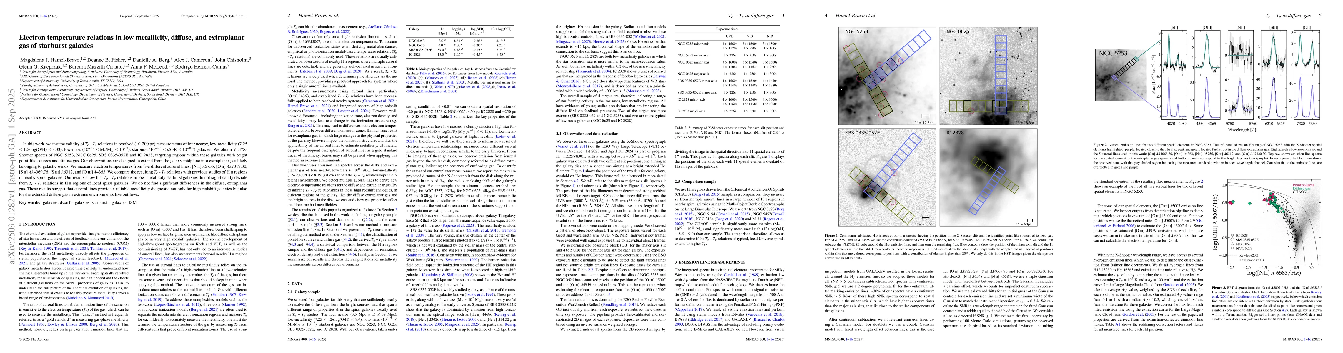 In this work, we test the validity of $T_e$ - $T_e$ relations in resolved (10-200~pc) measurements of four nearby, low-metallicity (7.25 $\leq$ 12+log(O/H) $\leq$ 8.33), low-mass (10$^{6.78}$ $\leq$ M$_*$/M$_\odot$ $\leq$ 10$^{8.7}$), starburst (10$^{-4.5}$ $\leq$ sSFR $\leq$ 10$^{-0.3}$) galaxies. We obtain VLT/X-Shooter spectra of NGC~5253, NGC~0625, SBS~0335-052E and IC~2828, targeting regions within these galaxies with bright point-like sources and diffuse gas. Our observations are designed to extend from the galaxy midplane into extraplanar gas likely belonging to galactic winds. We measure electron temperatures from five different auroral lines: [NII]~$\lambda$5755, [OII]~$\lambda\lambda$7319,30, [SII]~$\lambda\lambda$4069,76, [SIII]~$\lambda$6312, and [OIII]~$\lambda$4363. We compare the resulting $T_e$ - $T_e$ relations with previous studies of HII regions in nearby spiral galaxies. Our results show that $T_e$ - $T_e$ relations in low-metallicity starburst galaxies do not significantly deviate from $T_e$ - $T_e$ relations in HII regions of local spiral galaxies. We do not find significant differences in the diffuse, extraplanar gas. These results suggest that auroral lines provide a reliable metallicity diagnostic not only for high-redshift galaxies but also for the extended diffuse gas in extreme environments like outflows.