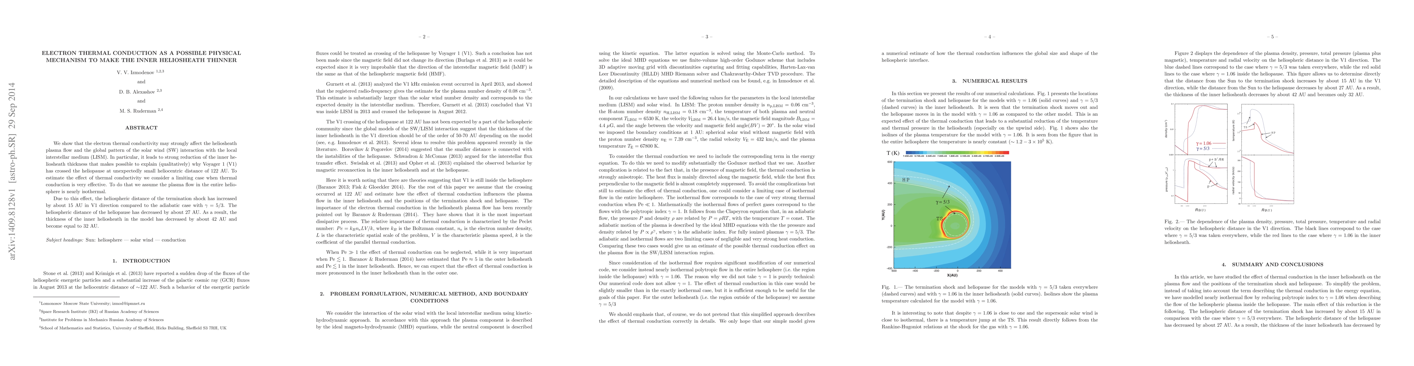We show that the electron thermal conductivity may strongly affect the heliosheath plasma flow and the global pattern of the solar wind (SW) interaction with the local interstellar medium (LISM). In particular, it leads to strong reduction of the inner heliosheath thickness that makes possible to explain (qualitatively) why Voyager 1 (V1) has crossed the heliopause at unexpectedly small heliocentric distance of 122 AU. To estimate the effect of thermal conductivity we consider a limiting case when thermal conduction is very effective. To do that we assume the plasma flow in the entire heliosphere is nearly isothermal. Due to this effect, the heliospheric distance of the termination shock has increased by about 15 AU in V1 direction compared to the adiabatic case with gamma = 5/3. The heliospheric distance of the heliopause has decreased by about 27 AU. As a result, the thickness of the inner heliosheath in the model has decreased by about 42 AU and become equal to 32 AU.