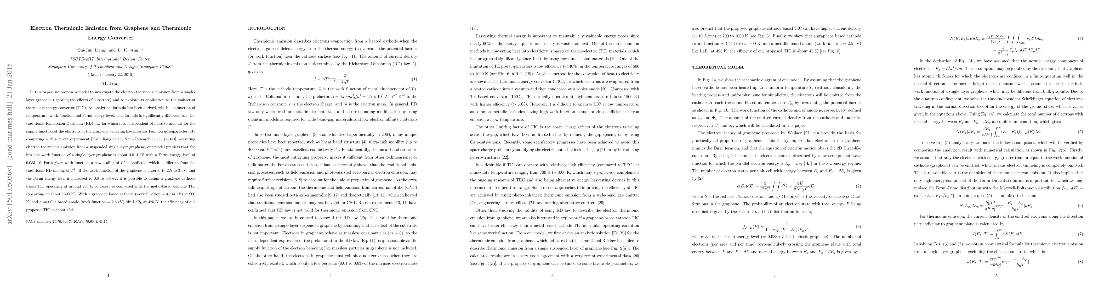 This paper proposes a novel model for electron thermionic emission from graphene, deriving an analytical formula independent of mass and differing from the traditional Richardson-Dushman law. The model predicts a graphene intrinsic work function of 4.514 eV and suggests a $T^{3}$ scaling, enabling the design of a graphene-based thermionic energy converter operating at lower temperatures than traditional metal-based systems.