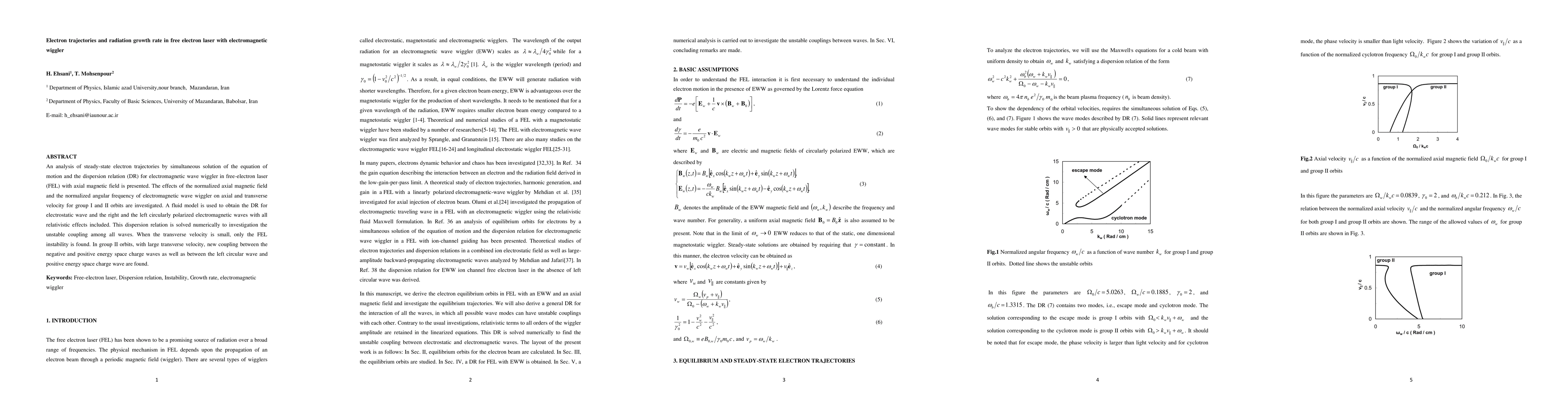 This paper analyzes electron trajectories in a free-electron laser with an electromagnetic wiggler, solving the equation of motion and dispersion relation. It investigates the impact of magnetic field and electromagnetic wave frequency on electron velocities, revealing new coupling phenomena in group II orbits with high transverse velocity.