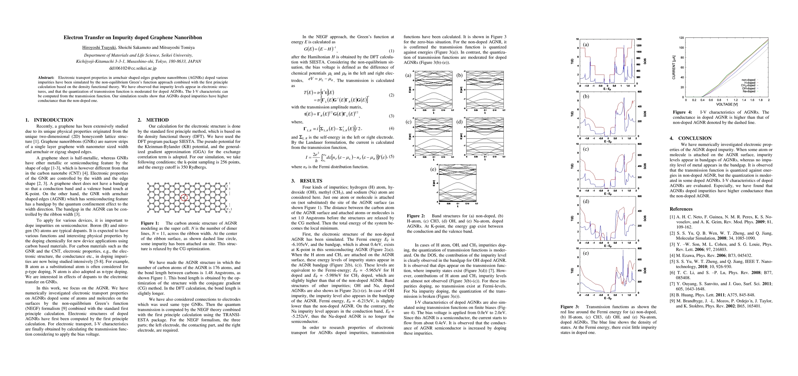 Electronic transport properties in armchair shaped edges graphene nanoribbons (AGNRs) doped various impurities have been simulated by the non-equilibrium Green's function approach combined with the first principle calculation based on the density functional theory. We have observed that impurity levels appear in electronic struc-tures, and that the quantization of transmission function is moderated for doped AGNRs. The I-V characteristic can be computed from the transmission function. Our simulation results show that AGNRs doped impurities have higher conductance than the non-doped one.