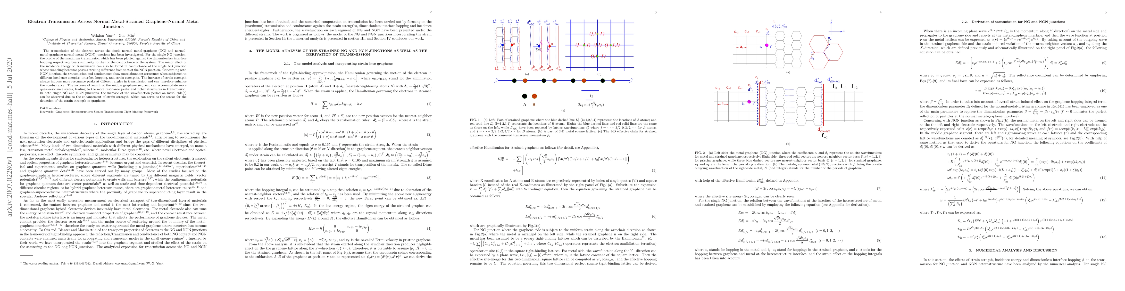 This paper investigates electron transmission across normal metal-graphene junctions, finding that strain and interface hopping significantly affect conductance and transmission profiles. In NGN junctions, increased strain and longer graphene segments enhance resonance peaks and conductance, while the wavefunction period in metals serves as a strain sensor.