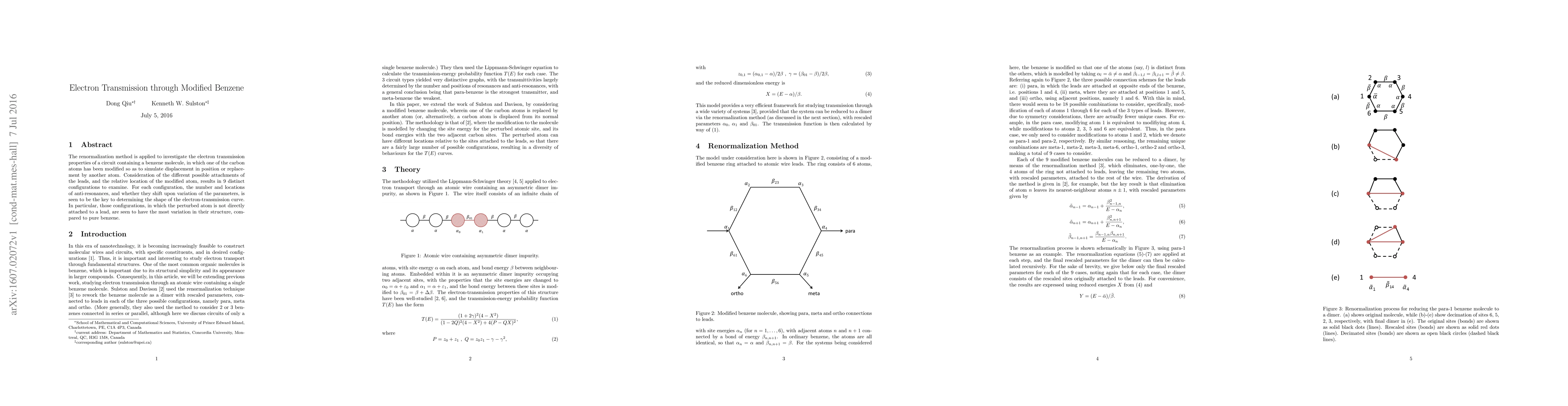 The renormalization method is applied to investigate the electron transmission properties of a circuit containing a benzene molecule, in which one of the carbon atoms has been modified so as to simulate displacement in position or replacement by another atom. Consideration of the different possible attachments of the leads, and the relative location of the modified atom, results in 9 distinct configurations to examine. For each configuration, the number and locations of anti-resonances, and whether they shift upon variation of the parameters, is seen to be the key to determining the shape of the electron-transmission curve. In particular, those configurations, in which the perturbed atom is not directly attached to a lead, are seen to have the most variation in their structure, compared to pure benzene.