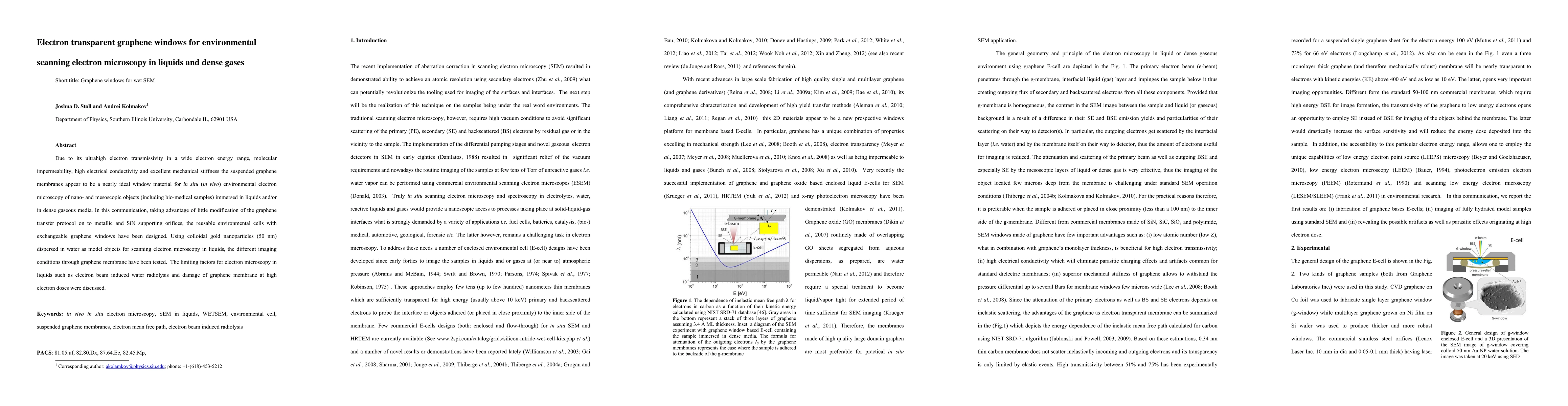 This paper presents graphene windows for environmental scanning electron microscopy (ESEM) in liquids and dense gases, highlighting their high electron transmissivity and mechanical stability. The study designs reusable ESEM cells with exchangeable graphene windows and tests imaging conditions using colloidal gold nanoparticles in water, discussing challenges like electron beam-induced water radiolysis and graphene damage.
