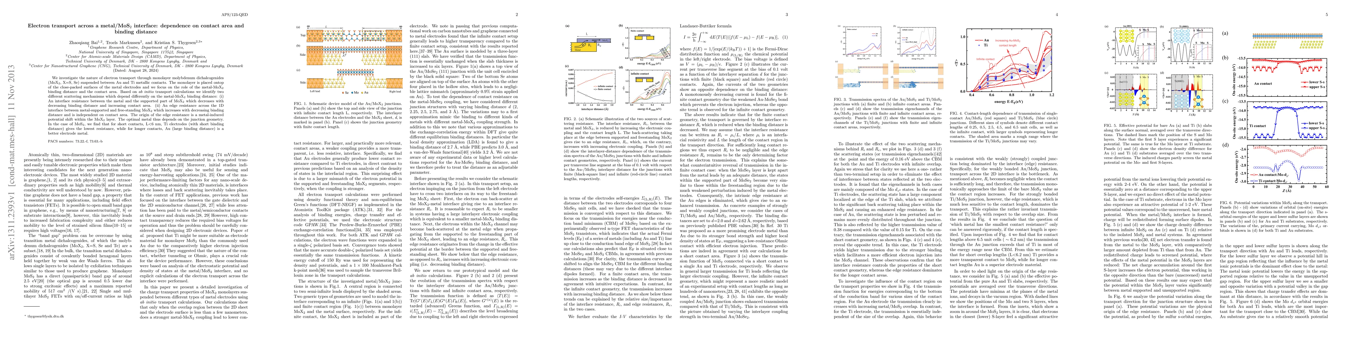 This paper investigates electron transport across metal/MoS$_2$ interfaces, finding that the contact area and metal-MoS$_2$ binding distance significantly affect resistance. It identifies two scattering mechanisms: an interface resistance decreasing with shorter binding distances and larger contact areas, and an edge resistance increasing with shorter binding distances, independent of contact area.
