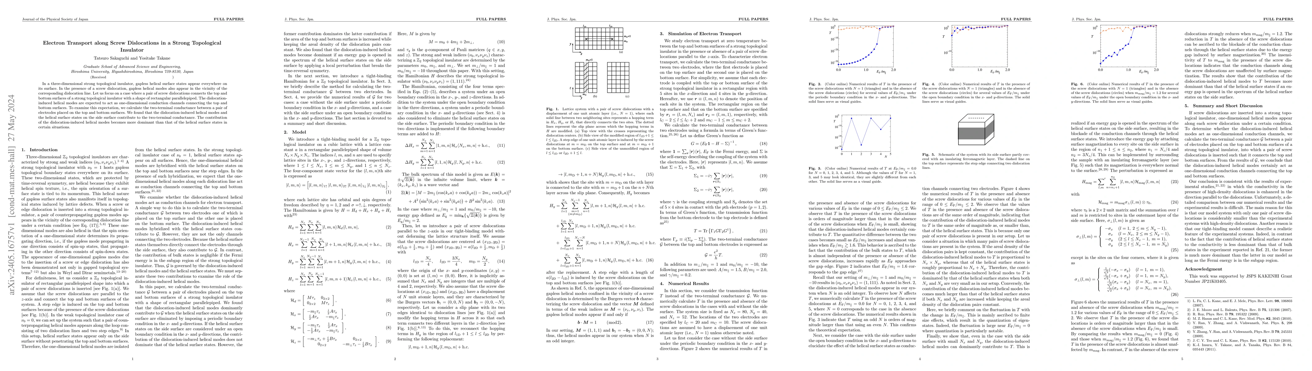 This research investigates electron transport along screw dislocations in a strong topological insulator, finding that dislocation-induced helical modes act as one-dimensional conduction channels. The study reveals that these modes, along with helical surface states, contribute to two-terminal conductance, with the dislocation-induced modes becoming more dominant under specific conditions.