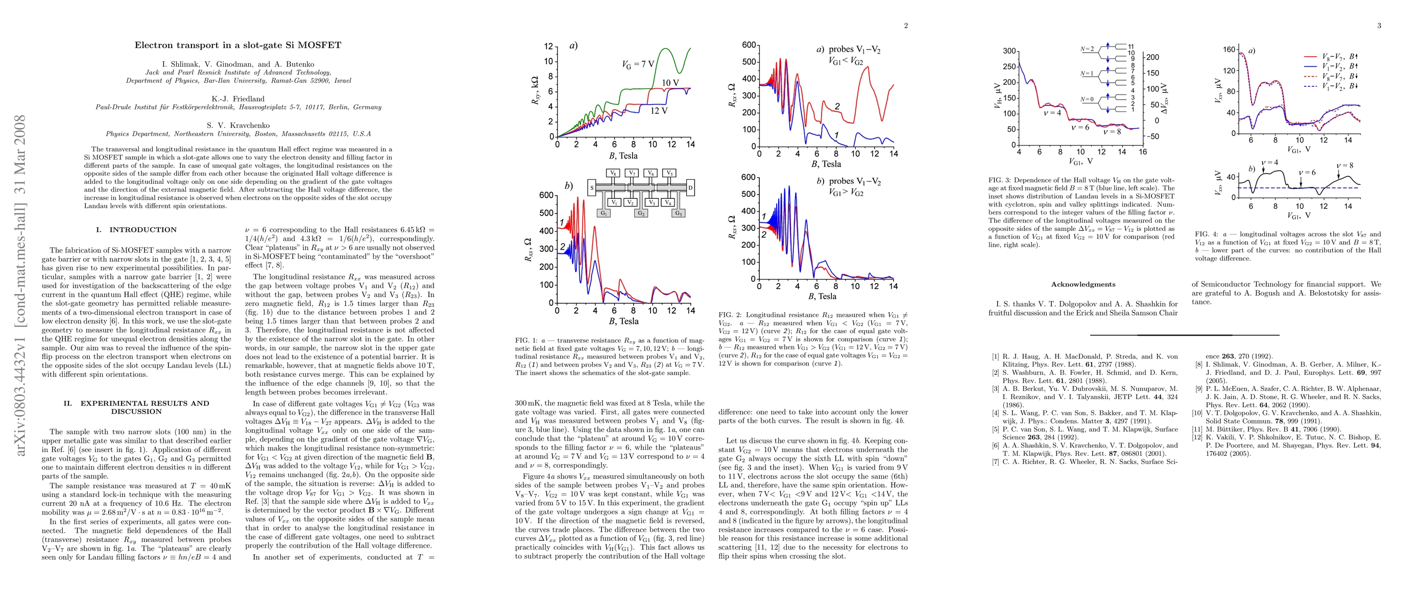The transversal and longitudinal resistance in the quantum Hall effect regime was measured in a Si MOSFET sample in which a slot-gate allows one to vary the electron density and filling factor in different parts of the sample. In case of unequal gate voltages, the longitudinal resistances on the opposite sides of the sample differ from each other because the originated Hall voltage difference is added to the longitudinal voltage only on one side depending on the gradient of the gate voltages and the direction of the external magnetic field. After subtracting the Hall voltage difference, the increase in longitudinal resistance is observed when electrons on the opposite sides of the slot occupy Landau levels with different spin orientations.