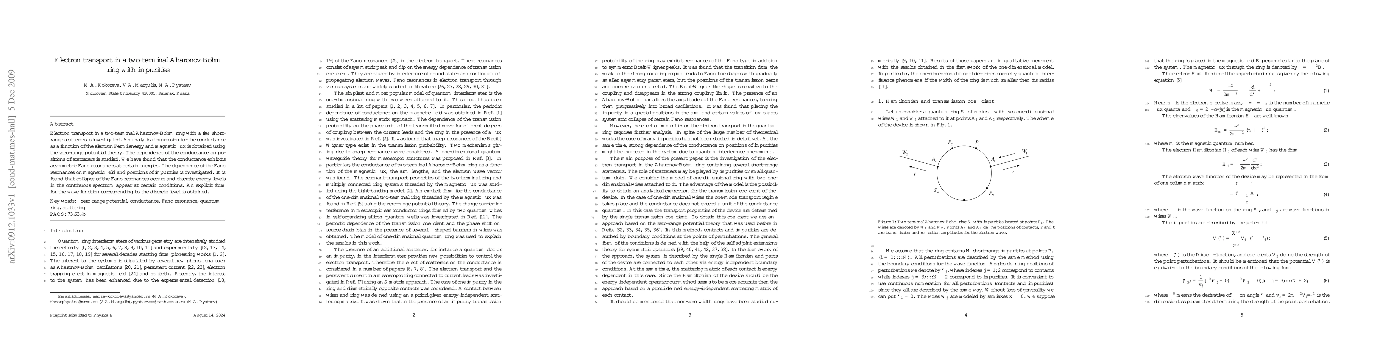 Researchers studied electron transport in a ring with impurities and found asymmetric Fano resonances that collapse under certain conditions, leading to discrete energy levels in the continuous spectrum.