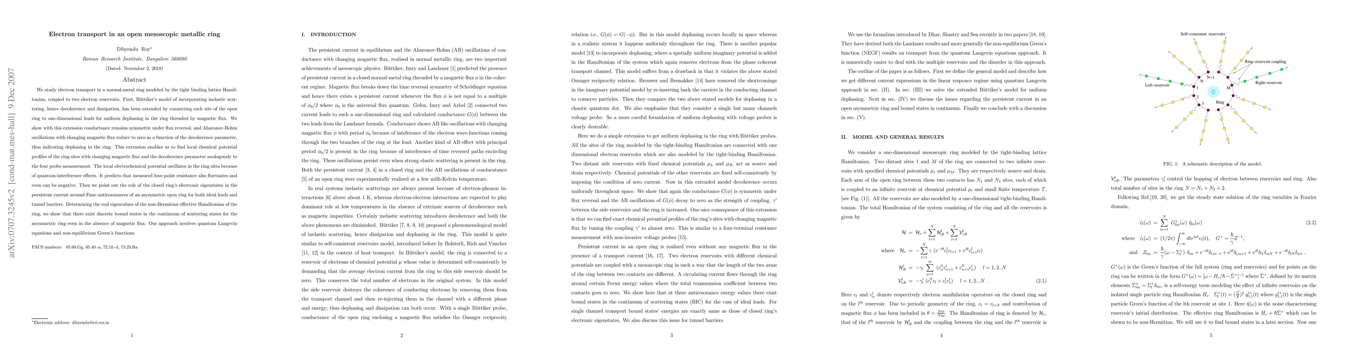 We study electron transport in a normal-metal ring modeled by the tight binding lattice Hamiltonian, coupled to two electron reservoirs. First, Buttiker's model of incorporating inelastic scattering, hence decoherence and dissipation, has been extended by connecting each site of the open ring to one-dimensional leads for uniform dephasing in the ring threaded by magnetic flux. We show with this extension conductance remains symmetric under flux reversal, and Aharonov-Bohm oscillations with changing magnetic flux reduce to zero as a function of the decoherence parameter, thus indicating dephasing in the ring. This extension enables us to find local chemical potential profiles of the ring sites with changing magnetic flux and the decoherence parameter analogously to the four probe measurement. The local electrochemical potential oscillates in the ring sites because of quantum-interference effects. It predicts that measured four-point resistance also fluctuates and even can be negative. Then we point out the role of the closed ring's electronic eigenstates in the persistent current around Fano antiresonances of an asymmetric open ring for both ideal leads and tunnel barriers. Determining the real eigenvalues of the non-Hermitian effective Hamiltonian of the ring, we show that there exist discrete bound states in the continuum of scattering states for the asymmetric ring even in the absence of magnetic flux. Our approach involves quantum Langevin equations and non-equilibrium Green's functions.