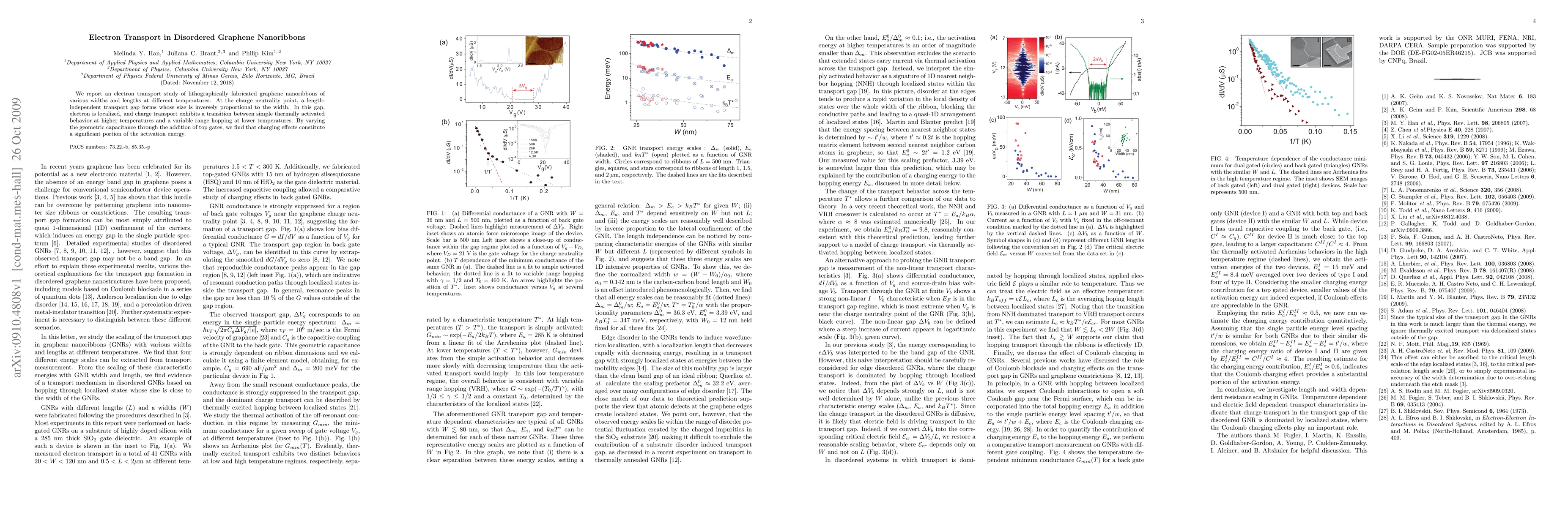 This study investigates electron transport in graphene nanoribbons at varying temperatures, revealing a length-independent transport gap at the charge neutrality point. Electrons are localized in this gap, showing thermally activated behavior at higher temperatures and variable range hopping at lower temperatures, with charging effects significantly influencing activation energy.