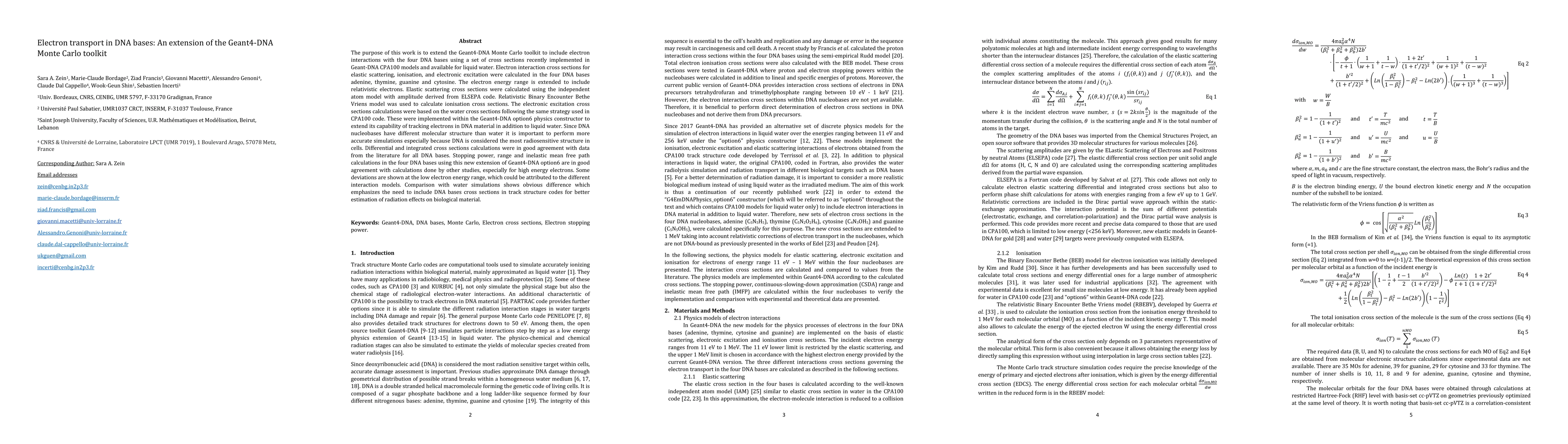 This paper extends the Geant4-DNA Monte Carlo toolkit to simulate electron interactions with DNA bases, including adenine, thymine, guanine, and cytosine, using newly calculated cross sections for elastic scattering, ionization, and electronic excitation. The results are in good agreement with literature data and highlight the importance of accurate simulations for radiosensitive DNA structures.