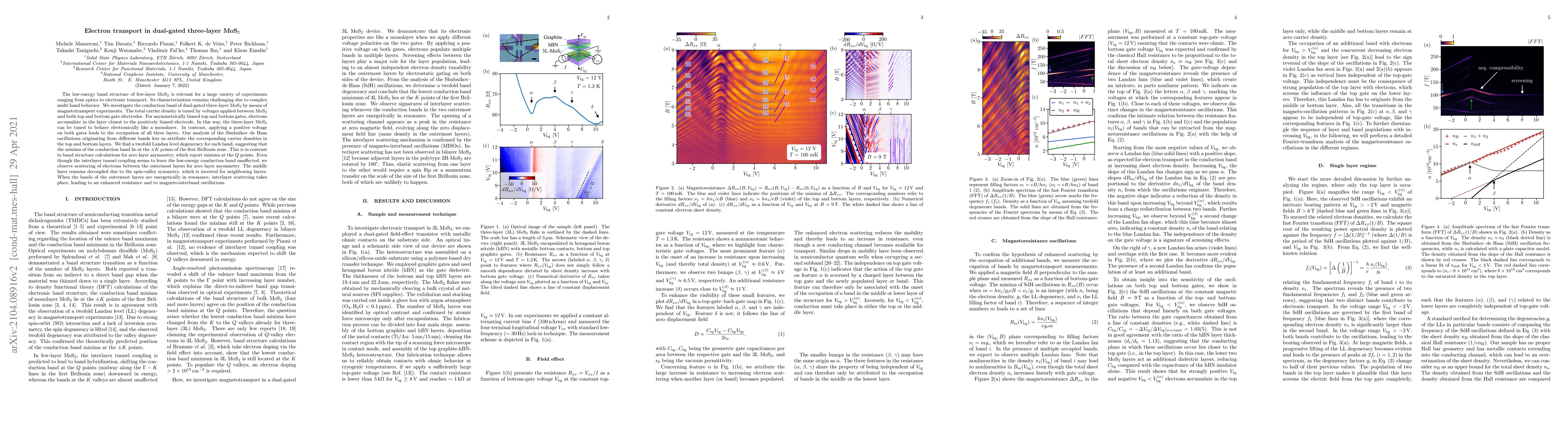 The low-energy band structure of few-layer MoS$_2$ is relevant for a large variety of experiments ranging from optics to electronic transport. Its characterization remains challenging due to complex multi band behavior. We investigate the conduction band of dual-gated three-layer MoS$_2$ by means of magnetotransport experiments. The total carrier density is tuned by voltages applied between MoS$_2$ and both top and bottom gate electrodes. For asymmetrically biased top and bottom gates, electrons accumulate in the layer closest to the positively biased electrode. In this way, the three-layer MoS$_2$ can be tuned to behave electronically like a monolayer. In contrast, applying a positive voltage on both gates leads to the occupation of all three layers. Our analysis of the Shubnikov--de Haas oscillations originating from different bands lets us attribute the corresponding carrier densities in the top and bottom layers. We find a twofold Landau level degeneracy for each band, suggesting that the minima of the conduction band lie at the $\pm K$ points of the first Brillouin zone. This is in contrast to band structure calculations for zero layer asymmetry, which report minima at the $Q$ points. Even though the interlayer tunnel coupling seems to leave the low-energy conduction band unaffected, we observe scattering of electrons between the outermost layers for zero layer asymmetry. The middle layer remains decoupled due to the spin-valley symmetry, which is inverted for neighboring layers. When the bands of the outermost layers are energetically in resonance, interlayer scattering takes place, leading to an enhanced resistance and to magneto-interband oscillations.