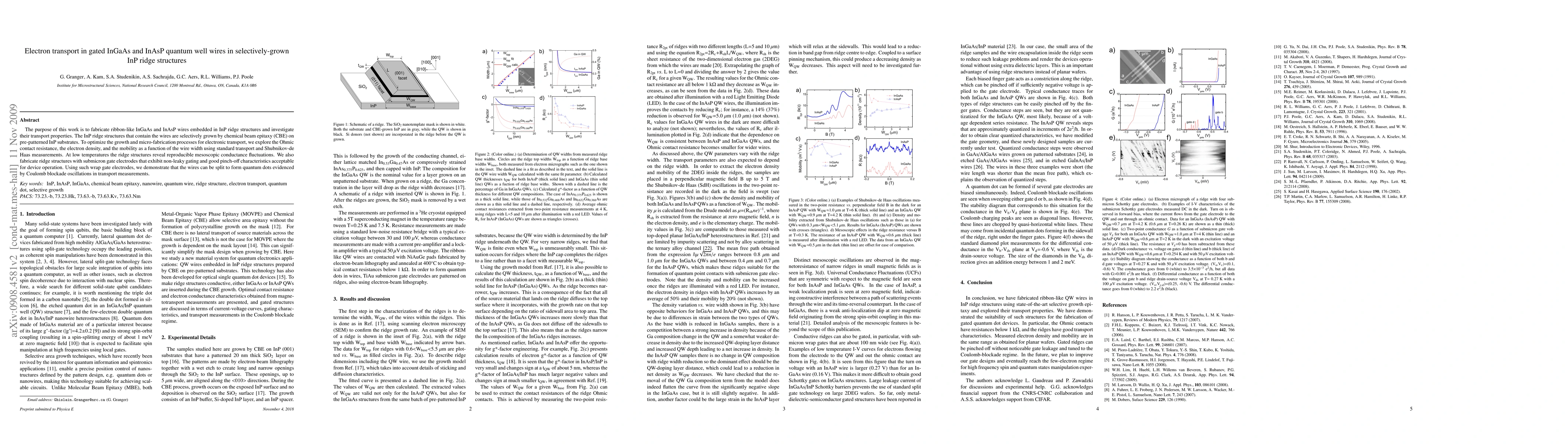 The purpose of this work is to fabricate ribbon-like InGaAs and InAsP wires embedded in InP ridge structures and investigate their transport properties. The InP ridge structures that contain the wires are selectively grown by chemical beam epitaxy (CBE) on pre-patterned InP substrates. To optimize the growth and micro-fabrication processes for electronic transport, we explore the Ohmic contact resistance, the electron density, and the mobility as a function of the wire width using standard transport and Shubnikov-de Haas measurements. At low temperatures the ridge structures reveal reproducible mesoscopic conductance fluctuations. We also fabricate ridge structures with submicron gate electrodes that exhibit non-leaky gating and good pinch-off characteristics acceptable for device operation. Using such wrap gate electrodes, we demonstrate that the wires can be split to form quantum dots evidenced by Coulomb blockade oscillations in transport measurements.