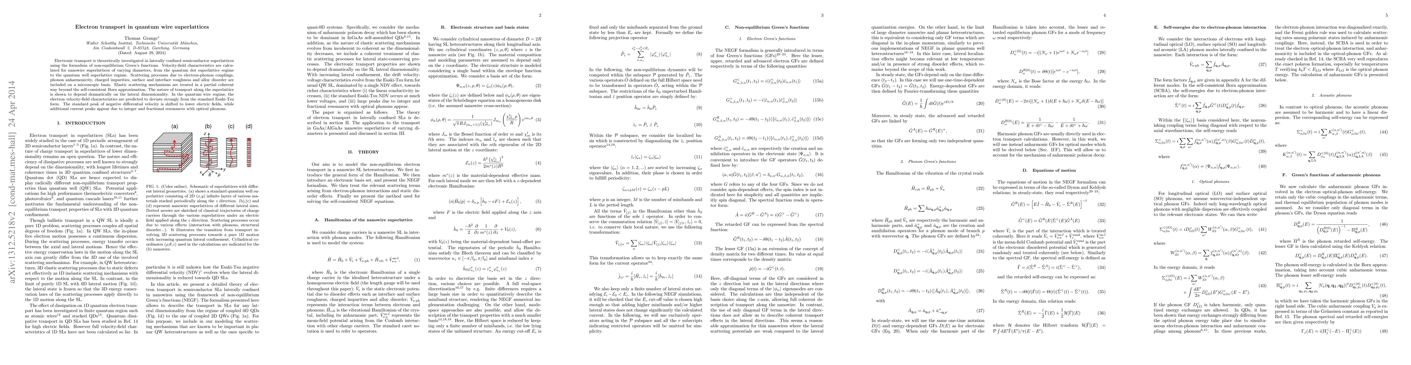 This paper investigates electronic transport in semiconductor superlattices using non-equilibrium Green's functions, focusing on nanowire superlattices transitioning from quantum dot to quantum well regimes. It reveals significant deviations in electron velocity-field characteristics and current peaks due to various scattering mechanisms, especially in the quantum wire regime.