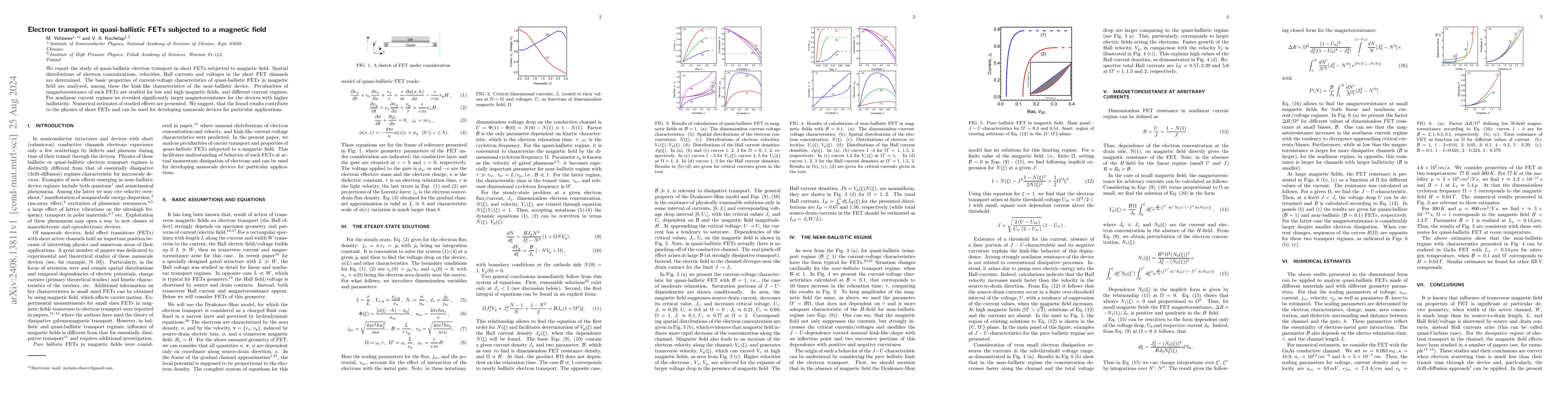 This study investigates quasi-ballistic electron transport in short field-effect transistors (FETs) under magnetic fields, analyzing spatial distributions of electron properties and current-voltage characteristics, revealing larger magnetoresistance in high ballisticity devices, and suggesting implications for nanoscale device development.