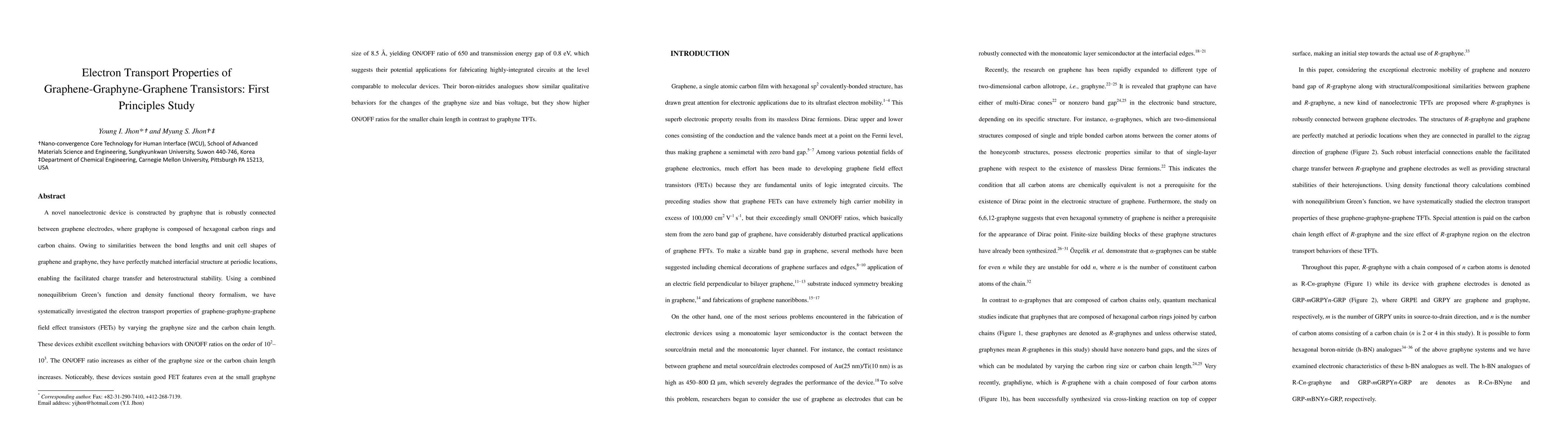 A novel nanoelectronic device is constructed by graphyne that is robustly connected between graphene electrodes, where graphyne is composed of hexagonal carbon rings and carbon chains. Owing to similarities between the bond lengths and unit cell shapes of graphene and graphyne, they have perfectly matched interfacial structure at periodic locations, enabling the facilitated charge transfer and heterostructural stability. Using a combined nonequilibrium Green's function and density functional theory formalism, we have systematically investigated the electron transport properties of graphene-graphyne-graphene field effect transistors (FETs) by varying the graphyne size and the carbon chain length. These devices exhibit excellent switching behaviors with ON/OFF ratios on the order of 10^2-10^3. The ON/OFF ratio increases as either of the graphyne size or the carbon chain length increases. Noticeably, these devices sustain good FET features even at the small graphyne size of 8.5 A, yielding ON/OFF ratio of 650 and transmission energy gap of 0.8 eV, which suggests their potential applications for fabricating highly-integrated circuits at the level comparable to molecular devices. Their boron-nitrides analogues show similar qualitative behaviors for the changes of the graphyne size and bias voltage, but they show higher ON/OFF ratios for the smaller chain length in contrast to graphyne TFTs.