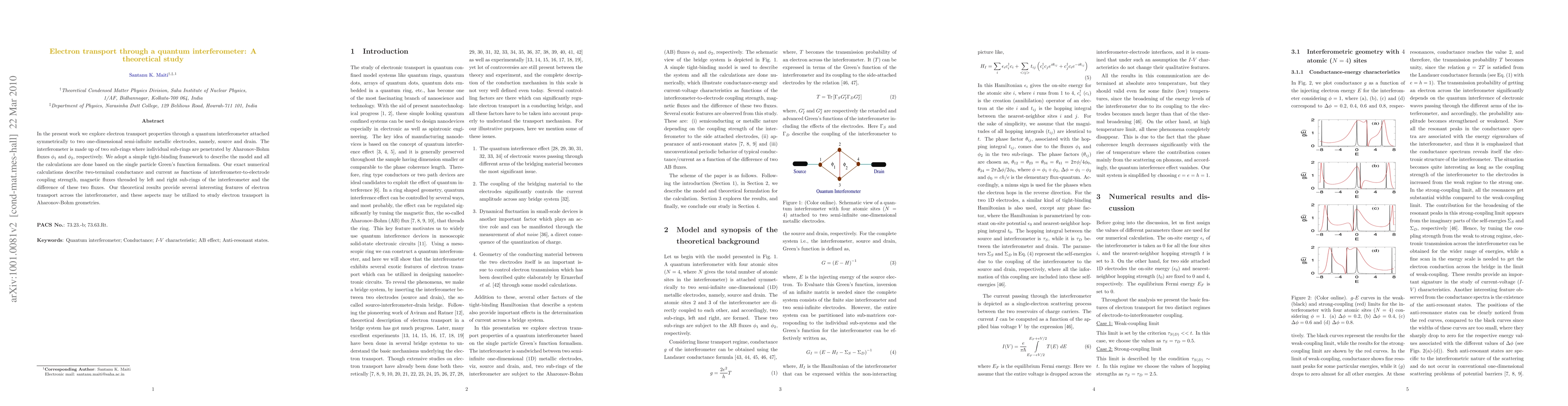 This paper investigates electron transport through a quantum interferometer connected to metallic electrodes, using a tight-binding model and Green's function formalism. It reveals unique conductance and current behaviors dependent on magnetic flux and coupling strength, offering insights for studying electron transport in Aharonov-Bohm geometries.