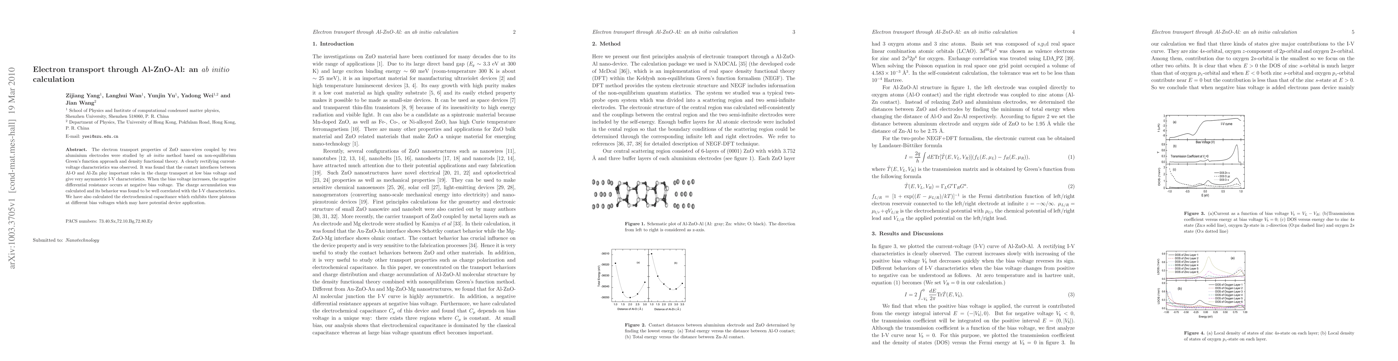 This paper uses {\it ab initio} calculations to study electron transport through Al-ZnO-Al nanostructures, revealing rectifying current-voltage characteristics and negative differential resistance due to the Al-O and Al-Zn interfaces. The electrochemical capacitance shows three plateaus, suggesting potential device applications.