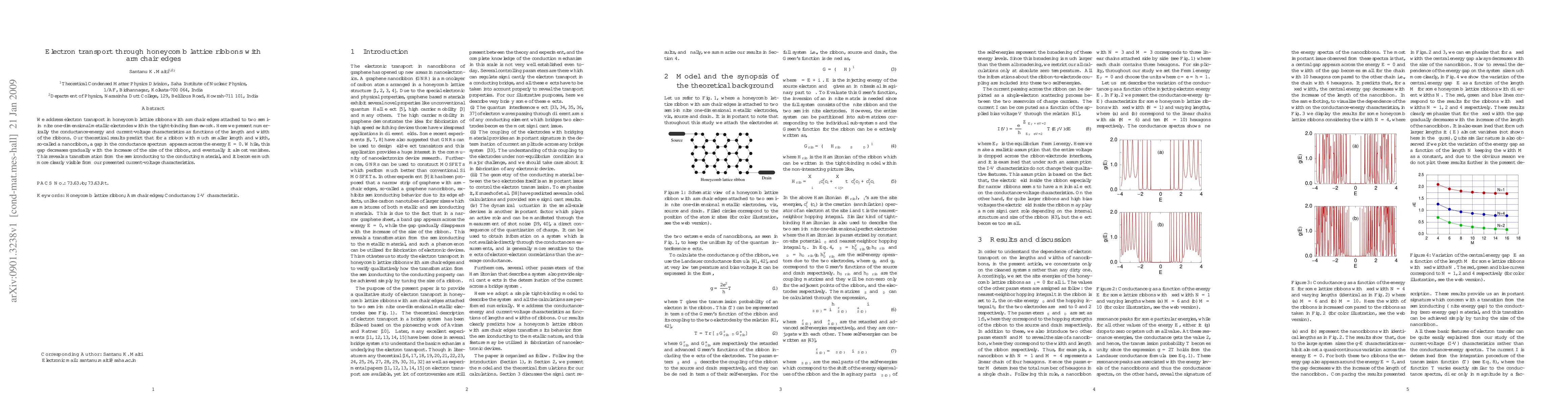 This paper investigates electron transport in honeycomb lattice ribbons with armchair edges connected to metallic electrodes, revealing a transition from semiconducting to conducting behavior as ribbon size increases, with a conductance gap appearing in nanoribbons that diminishes with larger dimensions.