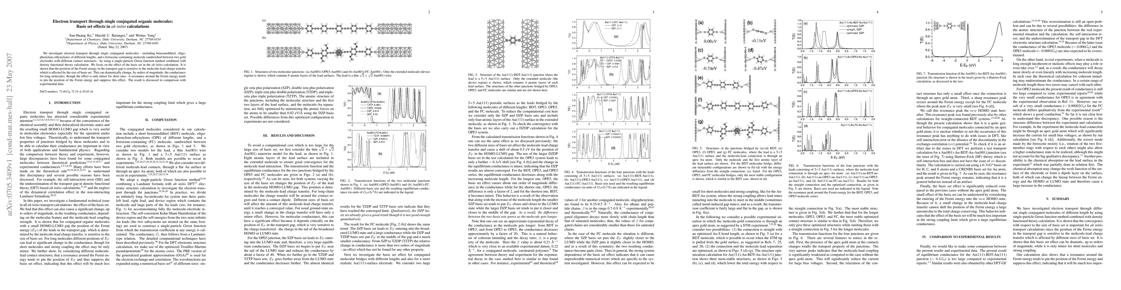 This study examines electron transport through various conjugated organic molecules using ab initio calculations, highlighting the significant impact of basis set size on the Fermi energy position and conductance, especially for longer molecules, while shorter molecules show minimal effect. The presence of resonance near the Fermi energy mitigates these variations.