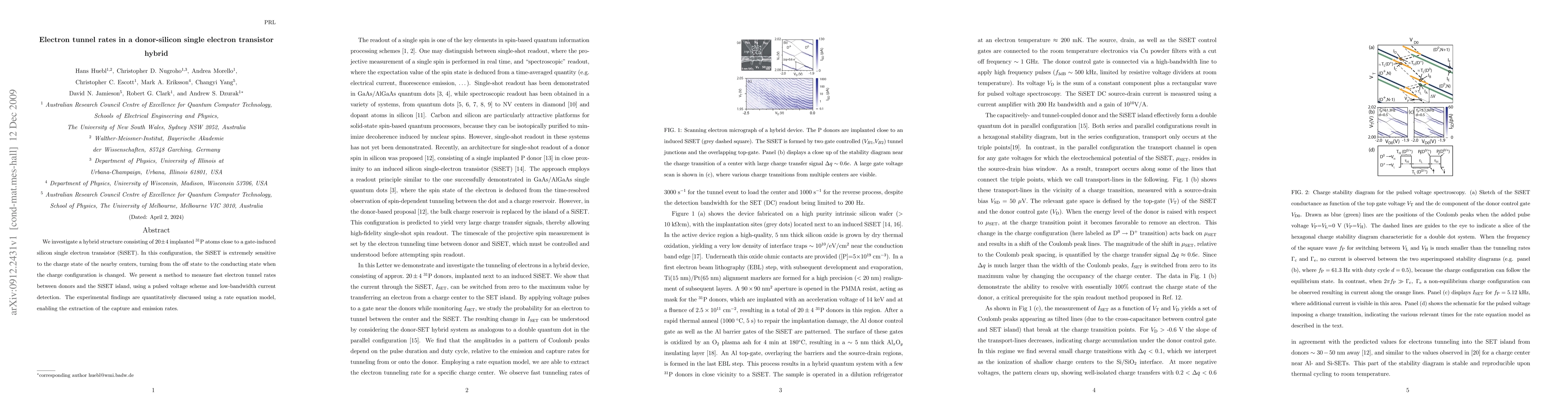 This study explores a hybrid donor-silicon single electron transistor (SiSET) structure, measuring electron tunnel rates via a pulsed voltage scheme. The findings reveal rapid electron tunneling between implanted phosphorus donors and the SiSET island, quantified through a rate equation model.