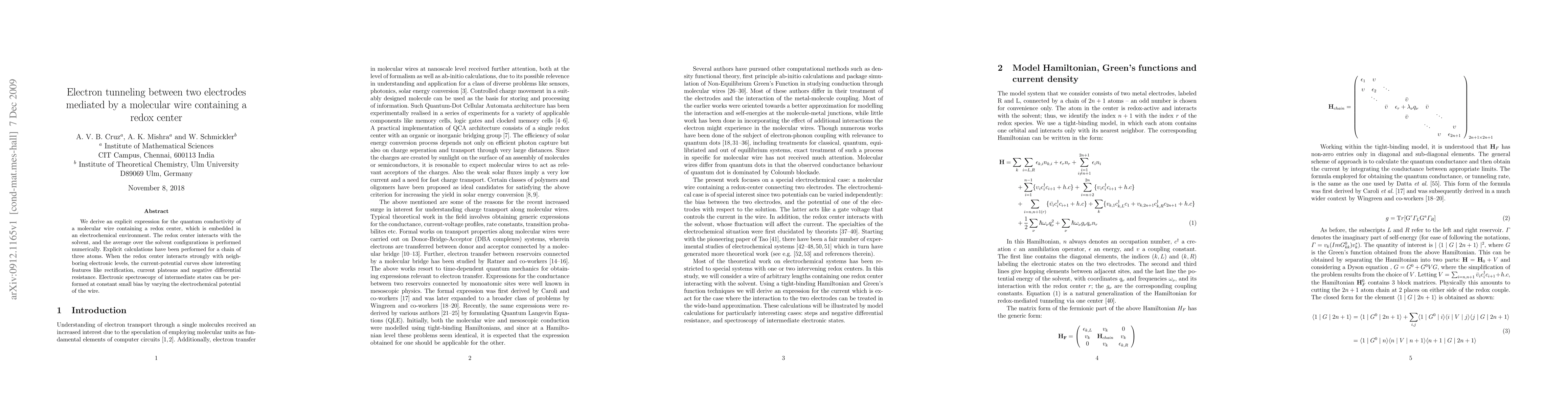 We derive an explicit expression for the quantum conductivity of a molecular wire containing a redox center, which is embedded in an electrochemical environment. The redox center interacts with the solvent, and the average over the solvent configurations is performed numerically. Explicit calculations have been performed for a chain of three atoms. When the redox center interacts strongly with neighboring electronic levels, the current-potential curves show interesting features like rectification, current plateaus and negative differential resistance. Electronic spectroscopy of intermediate states can be performed at constant small bias by varying the electrochemical potential of the wire.